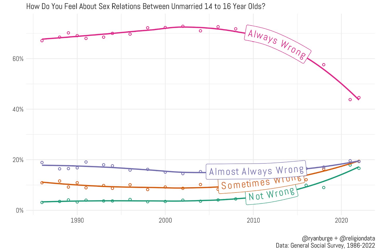 The wording on this question is interesting to me. Based on the question asked, I would probably answer ‘sometimes wrong’ based on concerns about knowledge, consent, etc. However, if the question were ‘is sex between 14-16 year olds a bad idea?’ I would answer Almost Always. I think a lot of the younger generations make more distinctions between what is ‘morally wrong’ and what is a generally a good or responsible choice. Obviously, you don’t have the data, but I would be very interested in the difference between those two concepts.