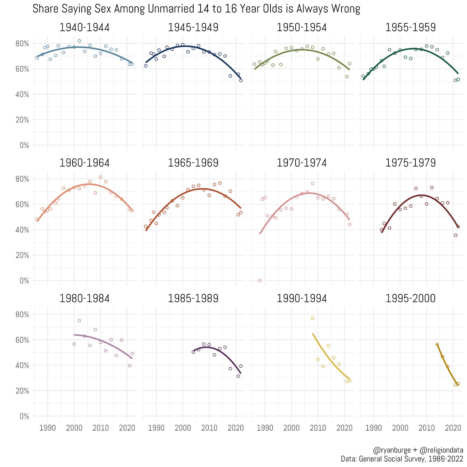 But this is just a snapshot of age from data collected in 2021 and 2022. It’s possible that a lot of these older folks today had a pretty libertine view of sexual behavior when they were in their twenties or thirties. I can test that possibility by doing a cohort analysis.