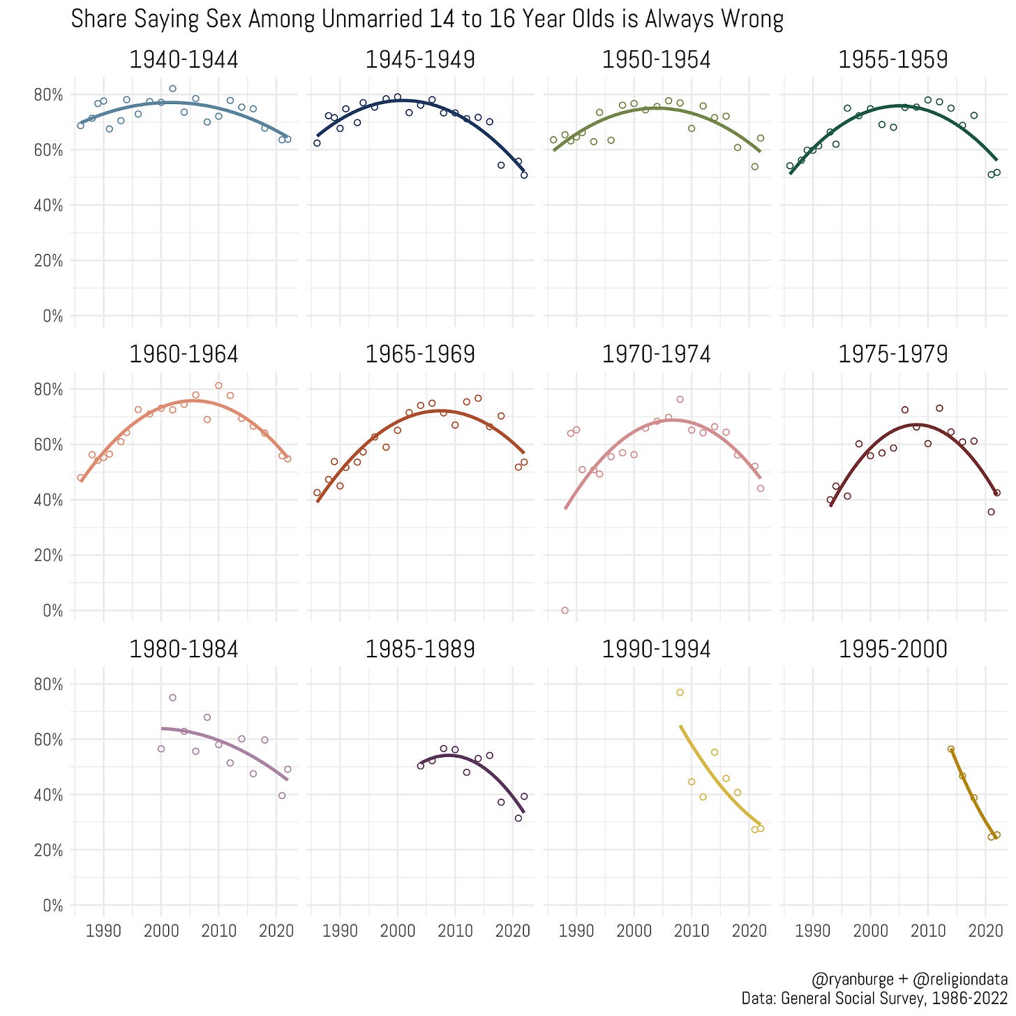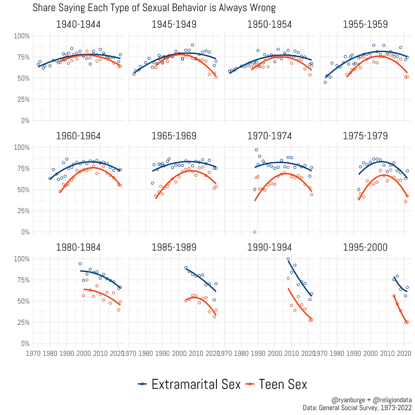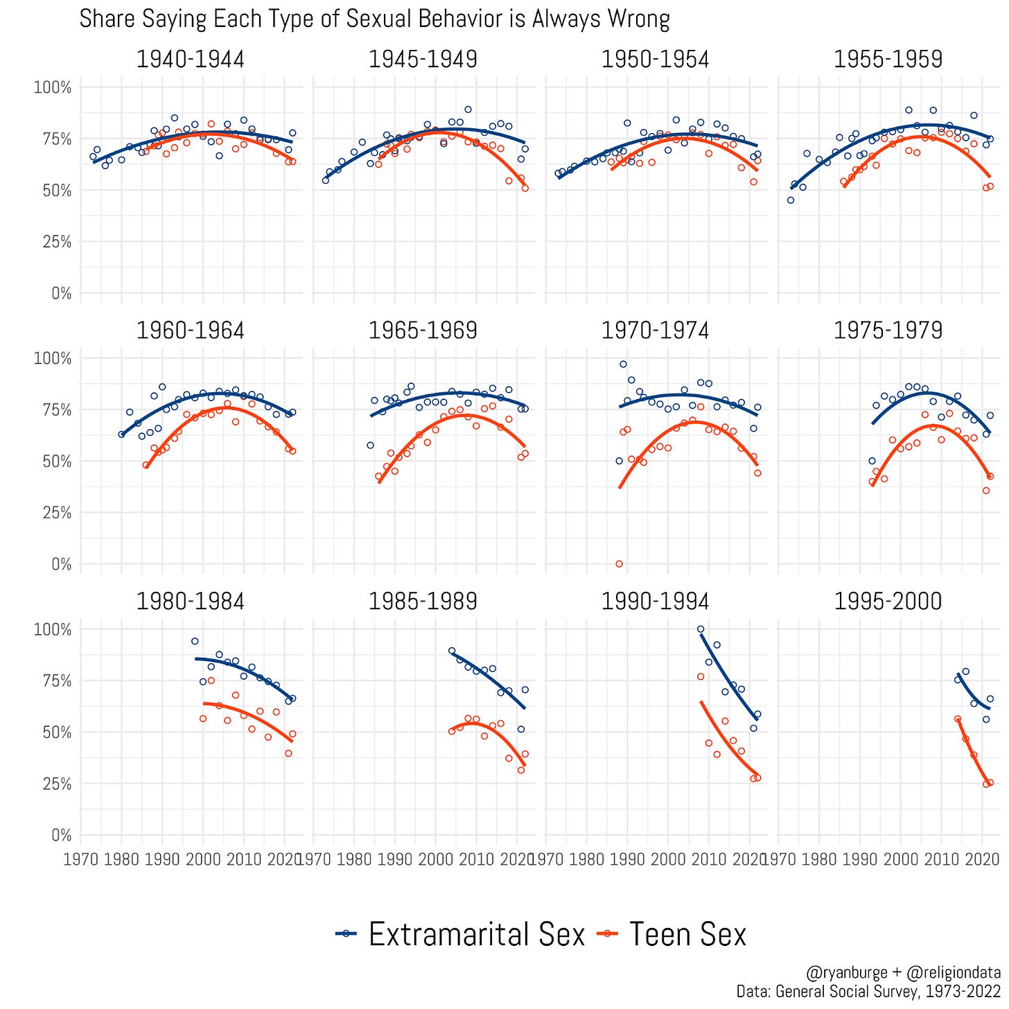 I was surprised by how small the gaps were between the two lines in the top row. Older folks don’t really make a huge distinction between sexual behavior in those circumstances. But, in the second row, a gap shows up. Among people born between 1960 and 1979, they definitely have a much dimmer view of extramarital sex than teen sex. That difference is also apparent in the bottom row, too.