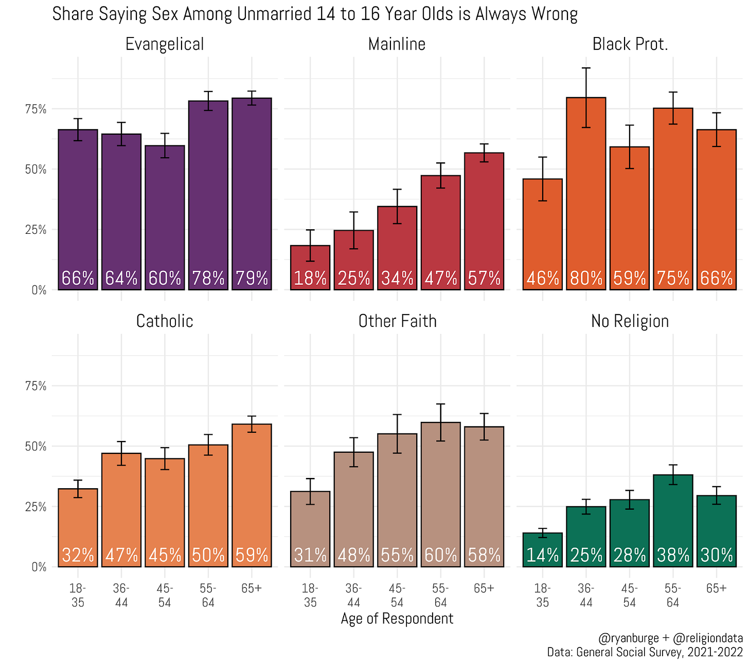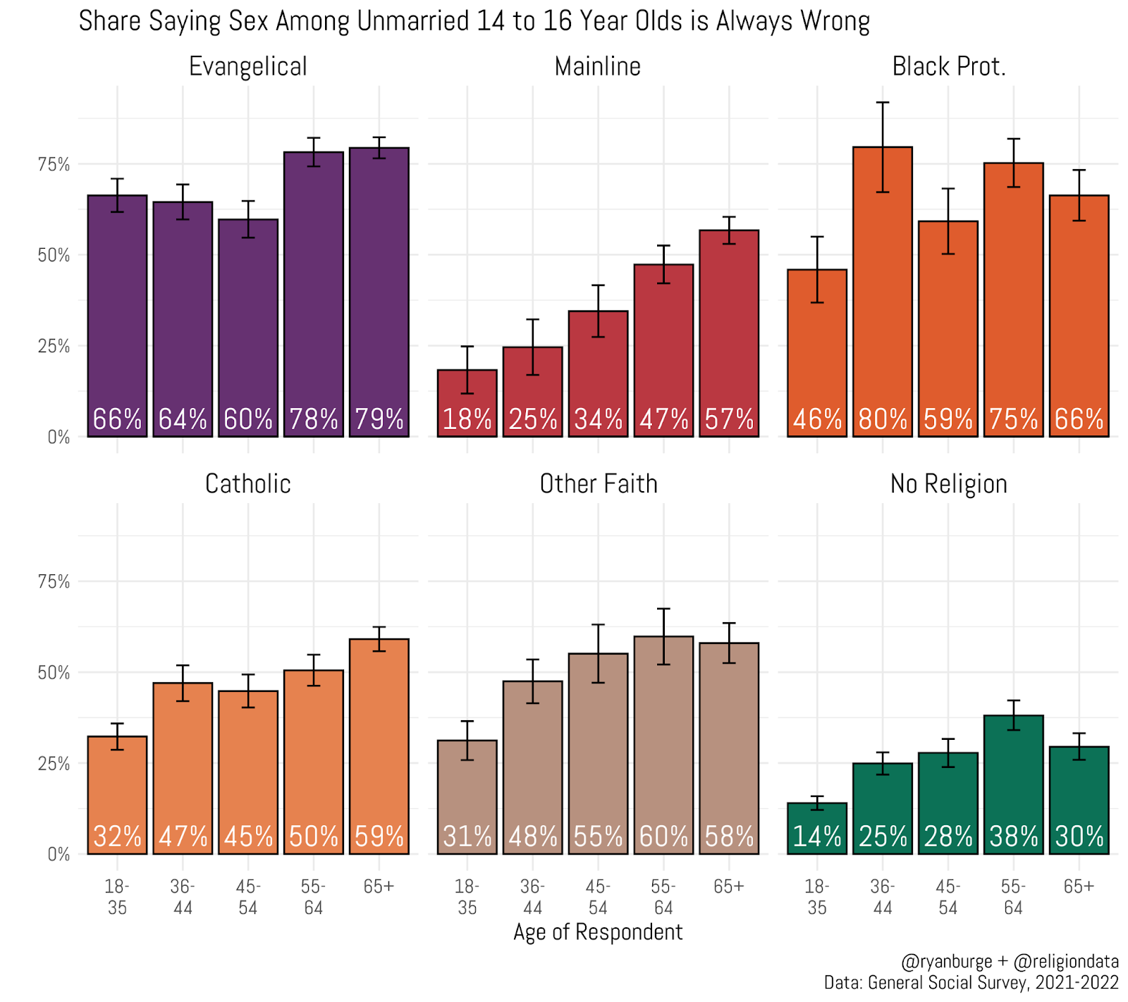 The data shows you can generally divide Christianity into two camps on this issue: Evangelicals and Black Protestants are in one group and mainline Protestants and Catholics are in the other. The age gap on this issue among evangelicals is really small. Among 18-35 year olds, 66% think that teen sex is always wrong. It’s 13 points higher among the oldest evangelicals. Among Black Protestants, the youngest cohort is probably an outlier because of a small sample size. I just don’t know if I see a clear trend line for this group.
