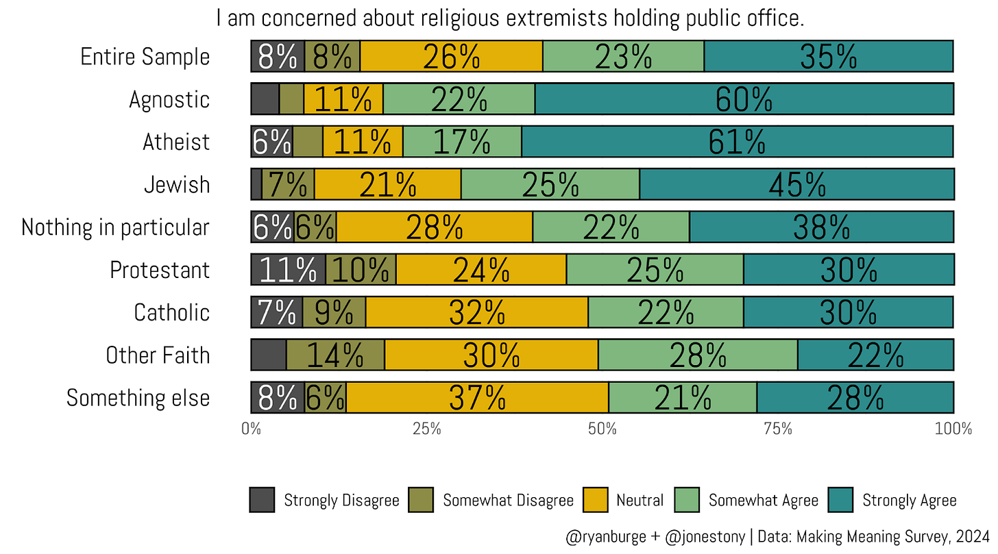 Let me end this by showing the responses to one last statement: “I am concerned about religious extremists holding public office.” Again, note how vague we were here. We didn’t mention fundamentalist Christians or devout Muslims—just religious extremists.