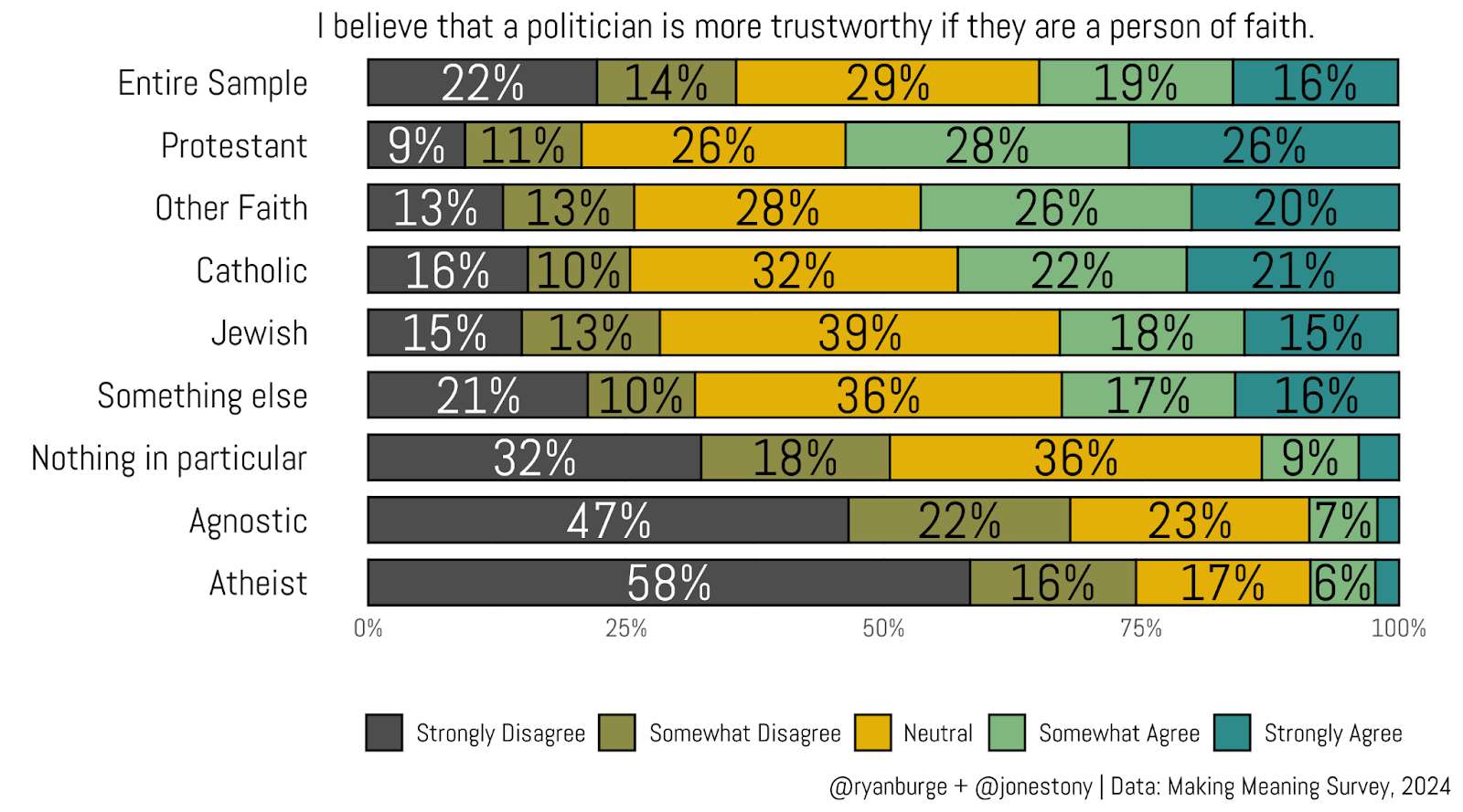 For the religious readers of this newsletter, the top row of this graph should sound some serious alarm bells. Only 35% of the public believes that religious politicians are more trustworthy. The exact same share disagrees with that statement. In other words, a religious politician is not any more trusted because of their faith declaration. The only group I could find where a majority agrees with that statement were Protestants, at 54%. For Catholics, it was only 43%.