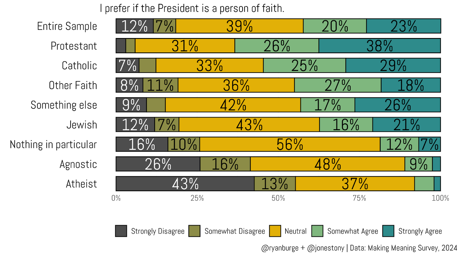 To that end, Tony Jones and I tried to take another angle on Christian Nationalism by asking our respondents to the Making Meaning survey to respond to a number of statements about the personal faith of elected officials. We like this set of questions because it comes at the concept of CN more directly. Instead of posing the statement, “The United States is a Christian nation,” we asked our respondents to engage with this one: “I prefer if the President is a person of faith.”