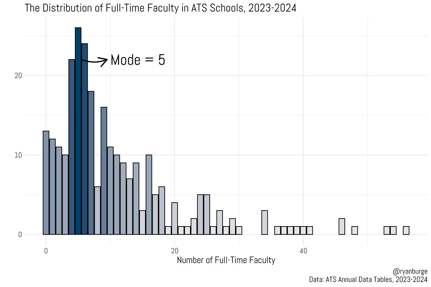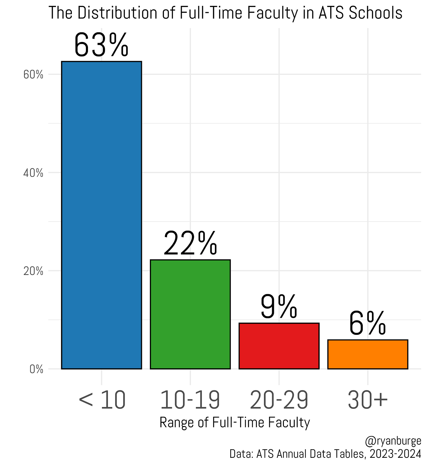 As you can probably tell - the average faculty size in one of these seminaries is pretty darn small. The mode (which is the number that shows up the most in the data) is 5 full-time faculty in a seminary. Remember, EIU’s political science department is 8 FT. A lot of small-ish liberal arts schools will often have four to six full time faculty each in sociology, economics, etc. In other words, there are a whole lot of very small staffs in the seminaries that are members of ATS.