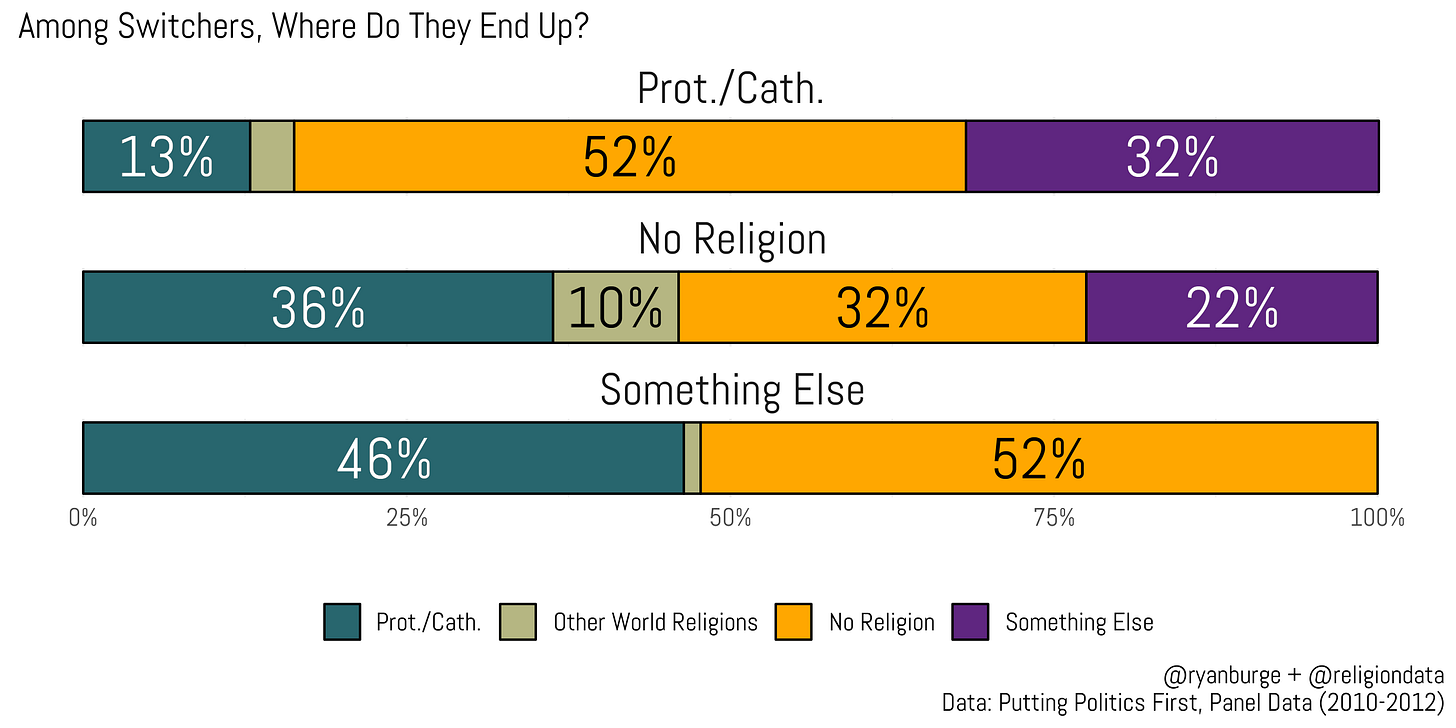 If a Protestant or Catholic leaves their religion, the majority end up identifying as 'nones' (those without a religious affiliation) - that was true for 52% of Christian switchers in this data. Another third goes into the “something else” category which is a potpourri of people who say that they are spiritual but not religious or Jedis or don’t know what the word Protestant means and will write something like “Baptist.”