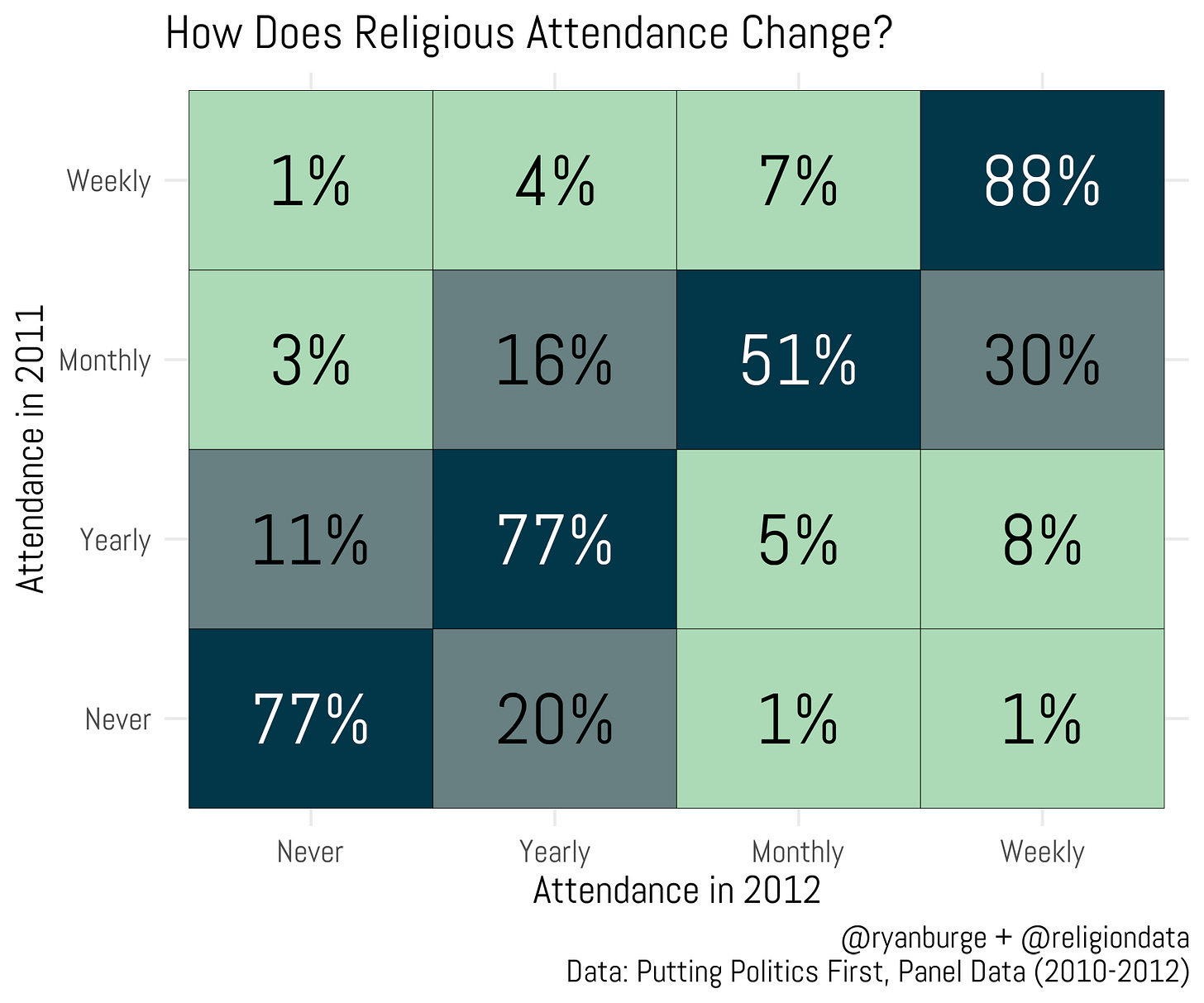One final question is worth pointing to: religious attendance. Respondents were asked about it in both the Summer of 2011 and the Fall of 2012. Here’s a heatmap of how attendance changed during those two collection periods.