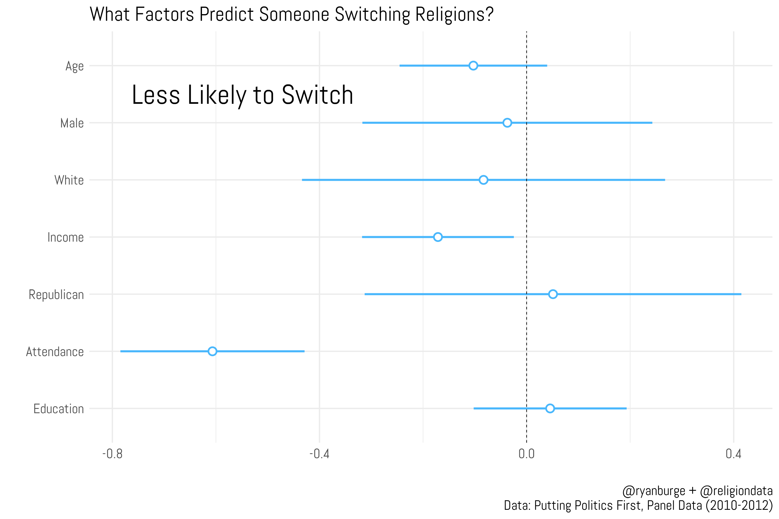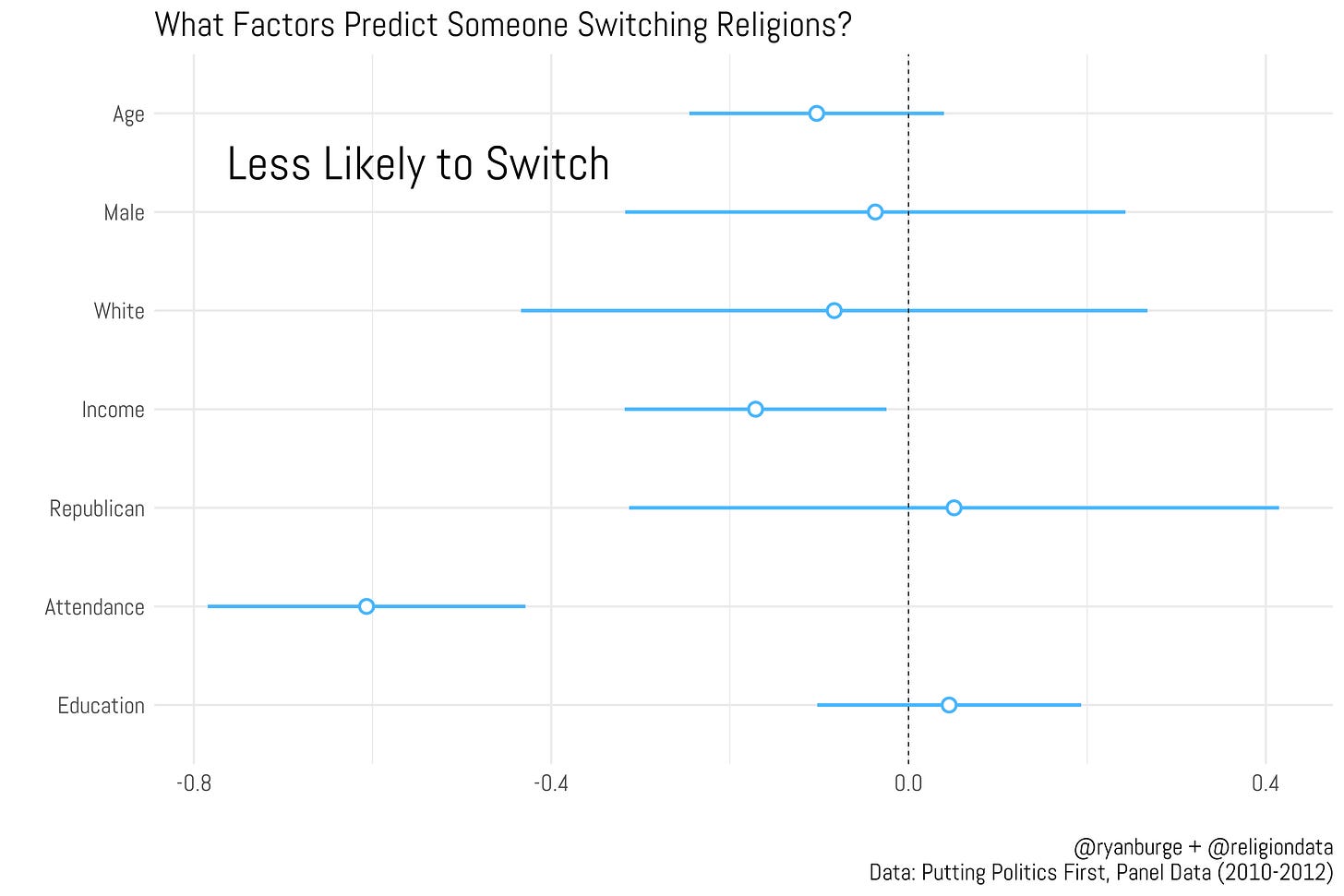 There were two variables that made one less likely to switch religions. The first was household income - individuals with higher household incomes were found to be less likely to change their religious affiliation. The other was religious attendance. Those who were attending their current house of worship more were less likely to switch. Which makes sense - very committed people tend to attend church more. A deeper commitment to their current faith makes one less likely to leave it behind.