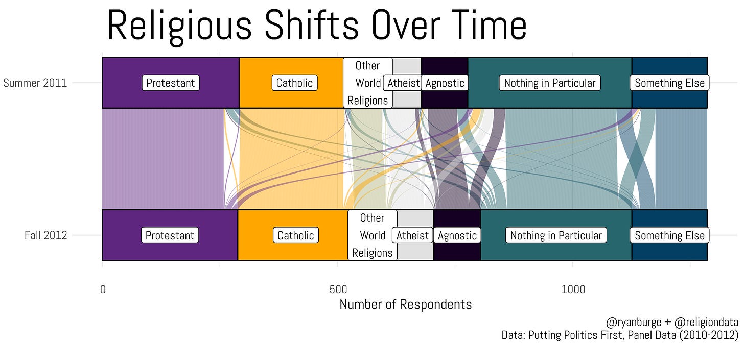 This is an alluvial diagram of how folks moved between identities during those two waves of the survey. These graphs are visually stunning but don’t really have the ability to provide actual numbers when it comes to shifts in religion. But you do get a general sense of how much volatility that’s happening when it comes to religious belonging. During this time period, about 21% of the sample changed their answer to a question about their present religion.