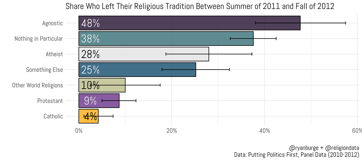 Let me put some actual numbers on this. There were a total of 36 people who identified as Agnostic in Wave 2 but weren’t agnostic in Wave 4. 8% of them became Catholic. You know how many actual respondents that is? Three people. So, it would be unwise to make some big proclamation about the agnostic to Catholic pipeline based on this survey.