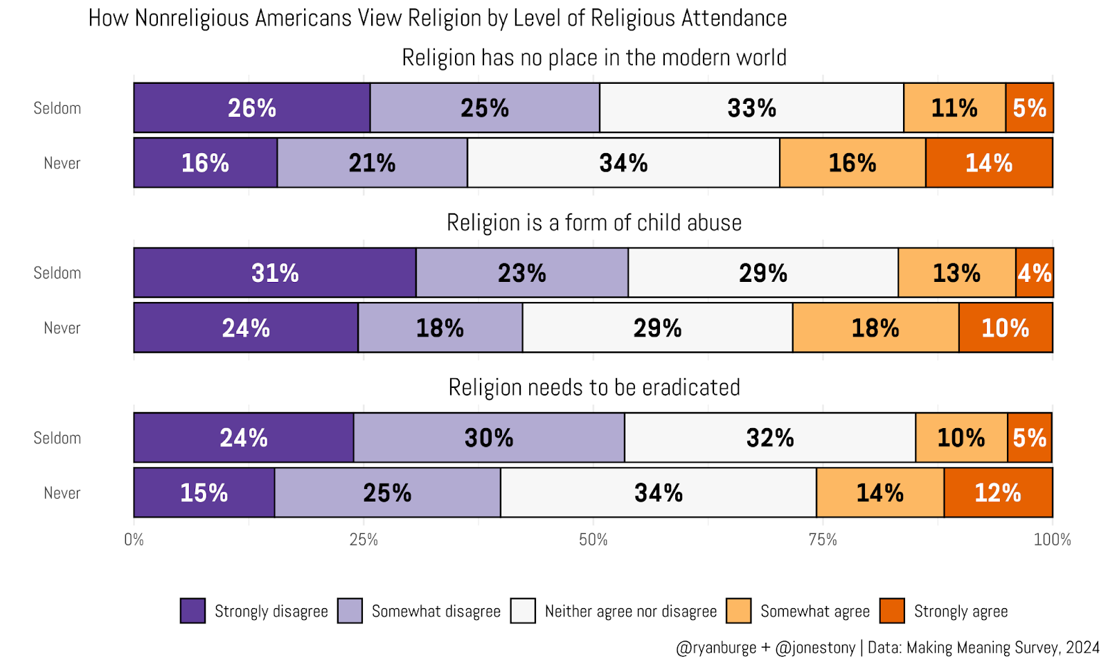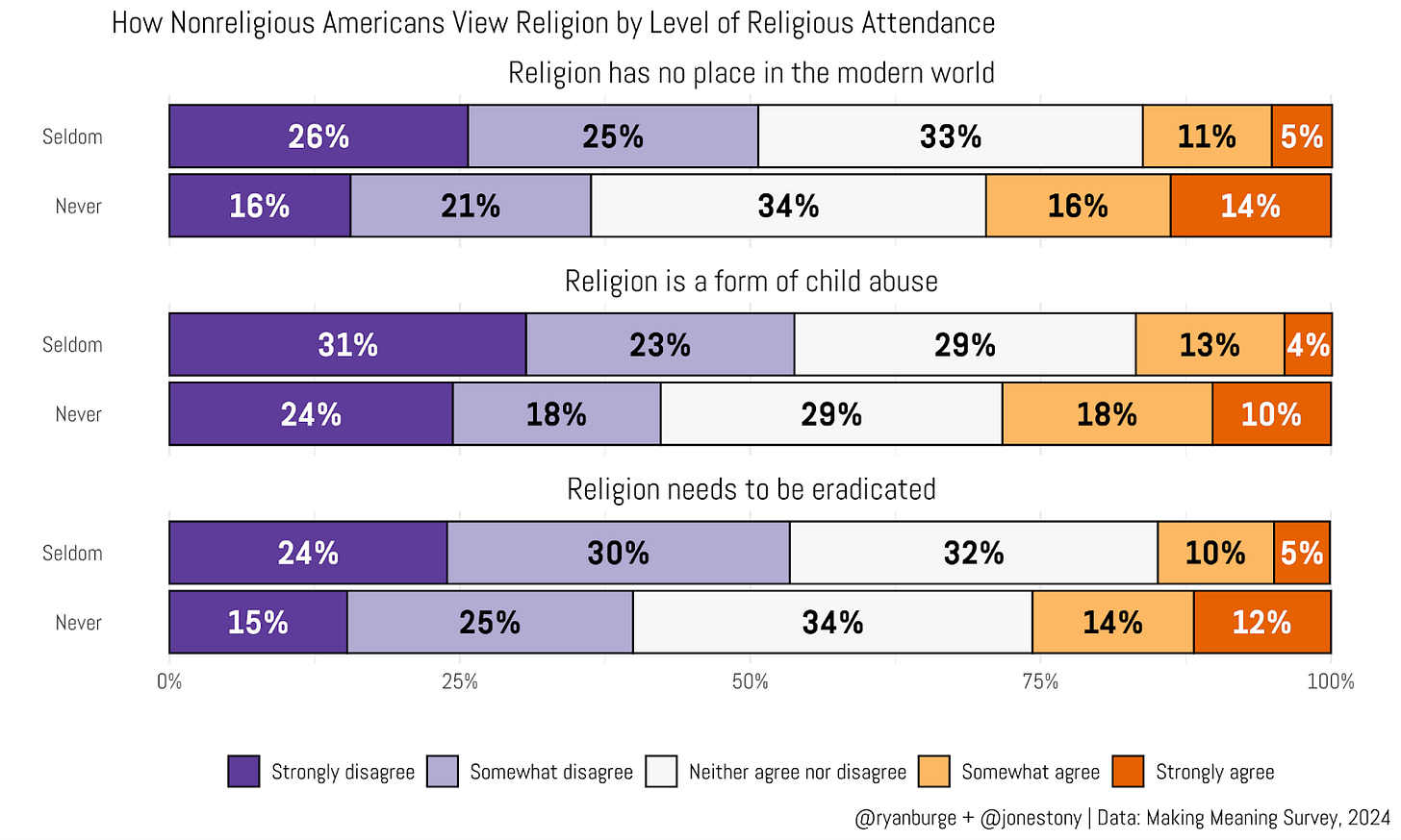 In each case, a majority of seldom-attending nones disagreed with the statement. The share who disagreed ranged from 51% to 54%. Among never attenders, disagreement was 12–14 points lower. The conclusion is pretty straightforward: seldom attenders express noticeably less opposition to religion than never attenders.