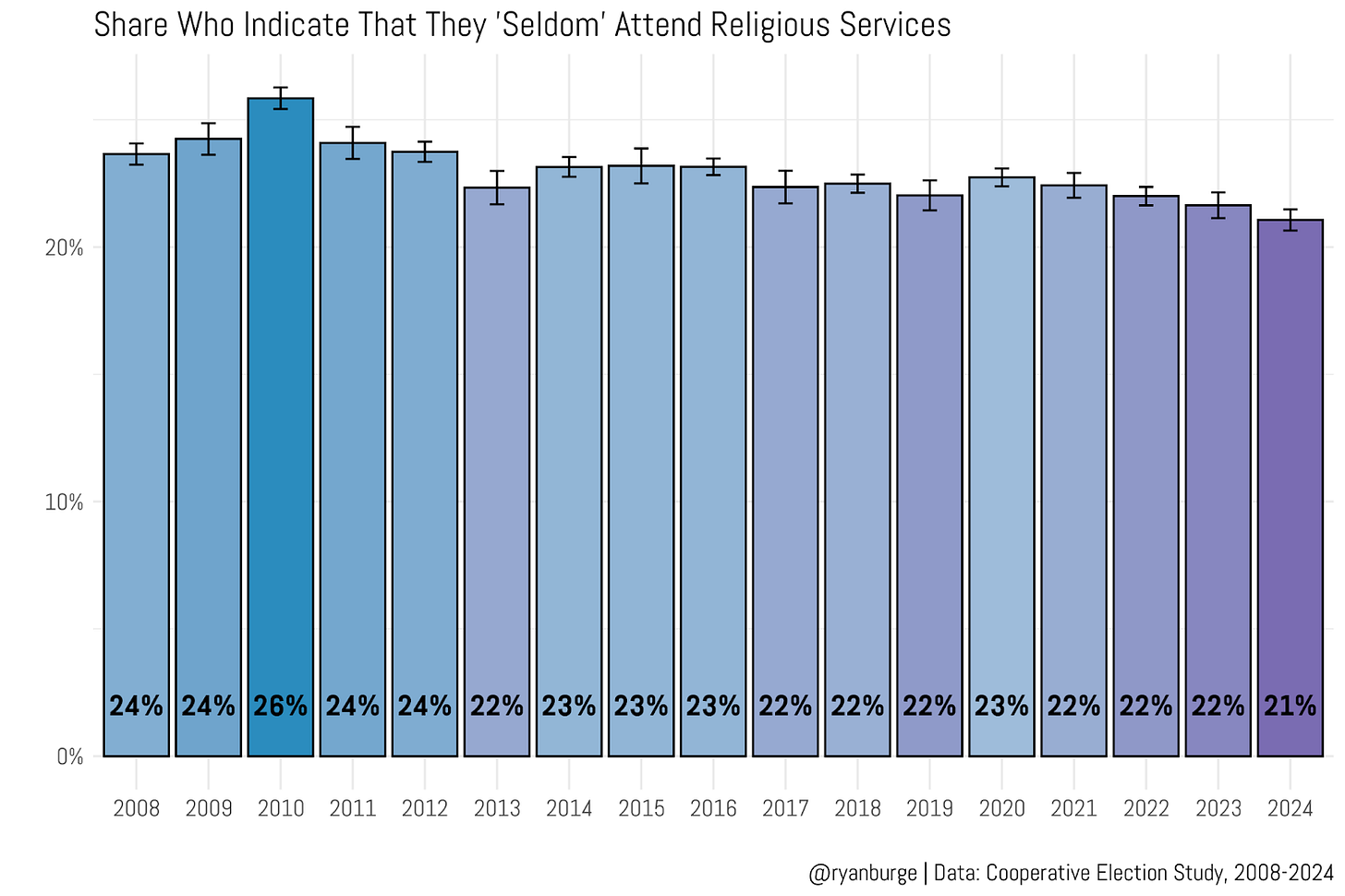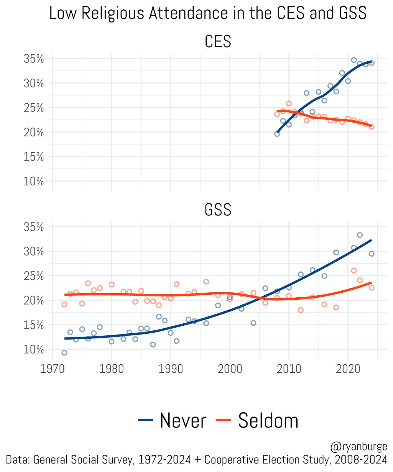 Now, there is a bit of a wiggle in the 2021, 2022, and 2024 results. The “seldom” category jumped to an all-time high of 26% in 2021, but that’s almost certainly about the weirdness of COVID and the fact that the GSS had to change its methodology. You can see that in the last two surveys, the ‘seldom’ share has started to drift back toward its historic baseline. Still, both the CES and the GSS are in the same general vicinity here: a bit more than 20% of Americans land in this ‘seldom’ category of attendance.
