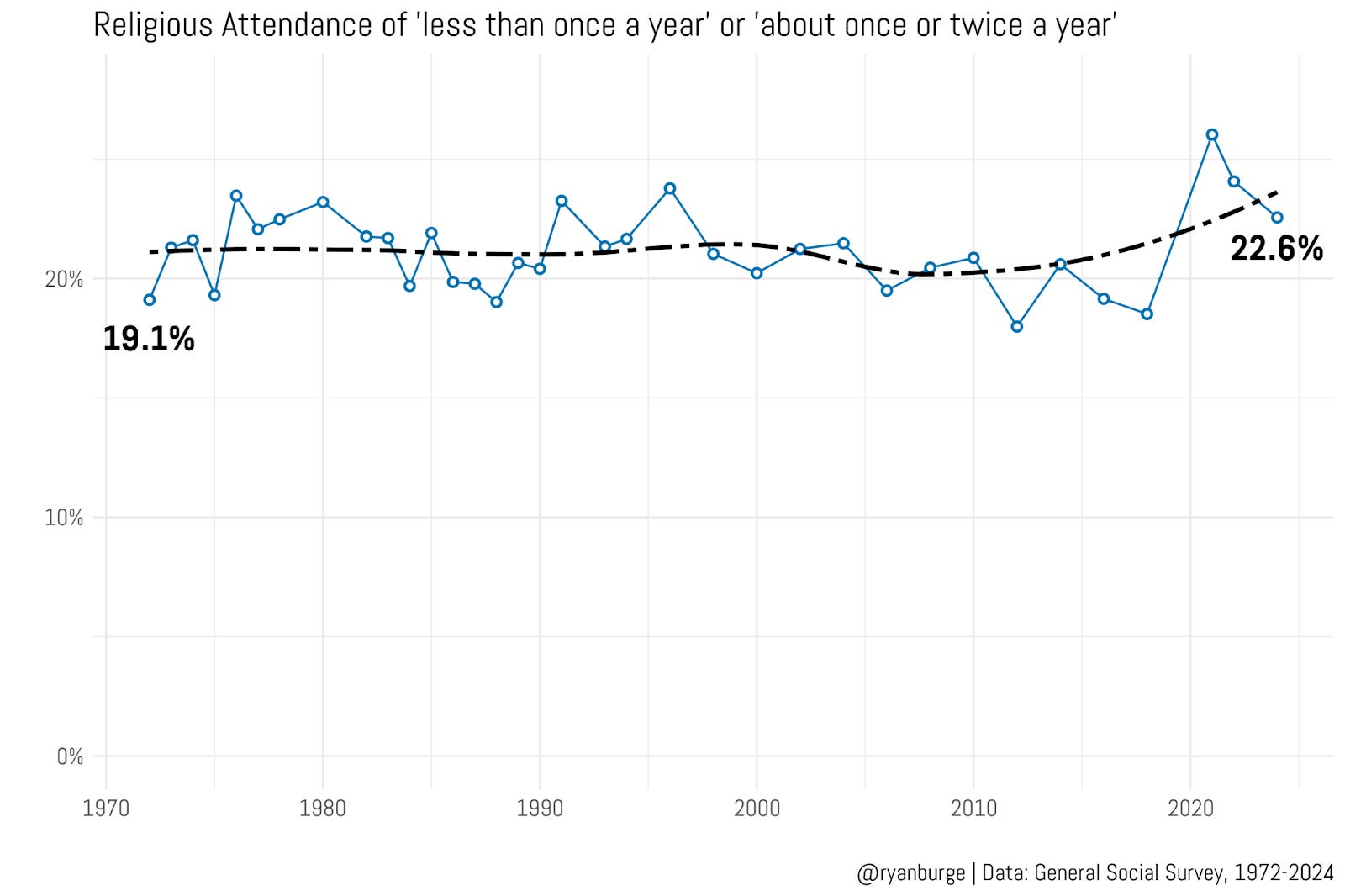 You can see that just over 20% of the sample falls into this “more than never but less than three times a year” crowd. And that figure stayed unbelievably stable for a very long period of time. It hovered around the 21–22% range from the mid-1970s all the way through the early 2010s. It’s remarkable to me that this number barely budged over a four-decade window, even as the overall religious composition of the United States shifted so dramatically.