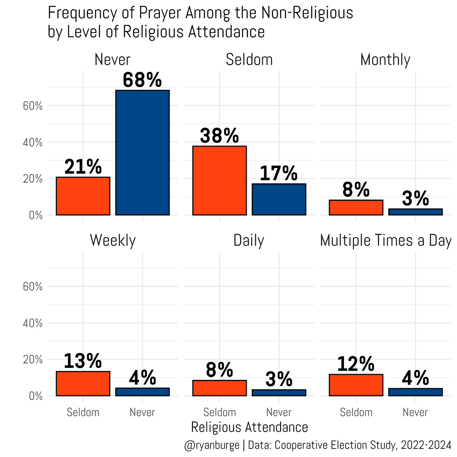Let me start by showing you a question about prayer frequency among the non-religious. In the next couple of questions, I’m just comparing never attenders to seldom attenders.