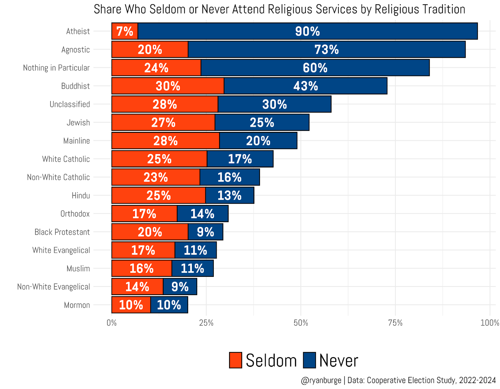 For instance, the group most likely to report that they ‘seldom’ attend religious services isn’t any type of none. Instead, it’s groups like Buddhists, the unclassified, Jews, and mainline Protestants. Among the most devout groups—Latter-day Saints and Muslims—the share who say they seldom attend is pretty marginal, usually under 10%.