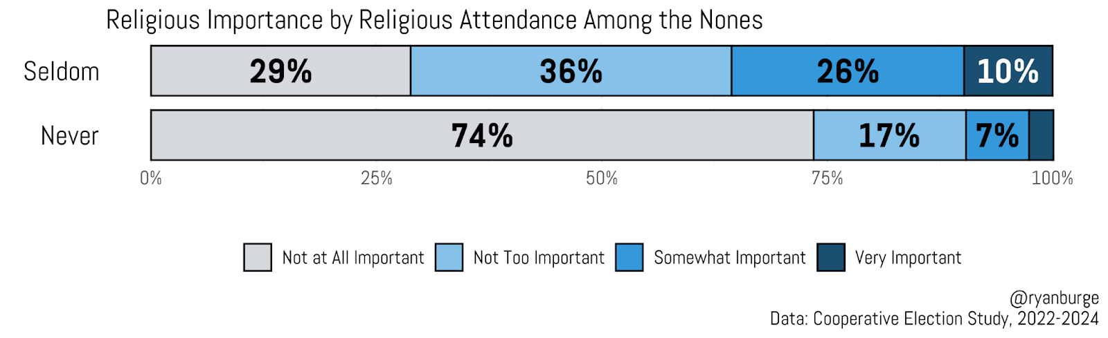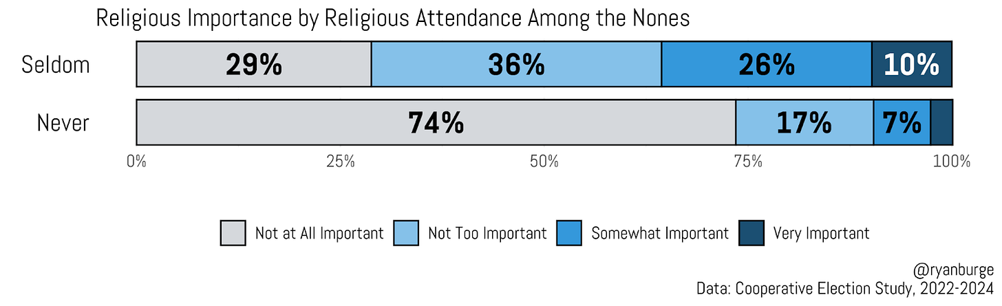Put simply, seldom attenders aren’t just slightly more religious than never attenders—the gap is substantial on both prayer frequency and religious importance. It would be hyperbolic to say that seldom-attending nones are warm to religion, but they certainly aren’t ice-cold toward religious practices or the idea that religion plays a meaningful role in their lives.