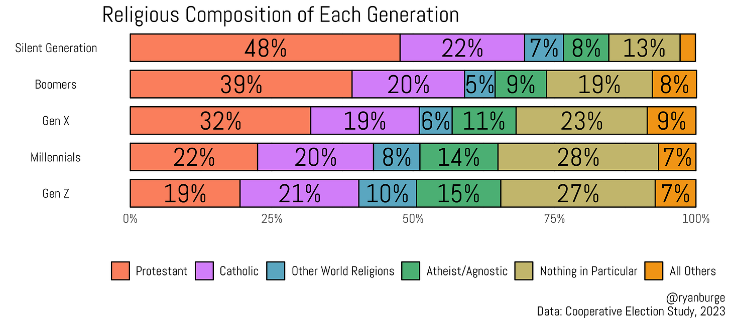 I included one graph here that just didn’t really seem right. It’s the one below - religious composition by generation. The general trends are there: older generations tend to be more Christian and less "none," but those numbers begin to shift for each successive generation. But here’s where the experience comes in. I had made that graph before for something I had written a while ago. It’s the second one in this post: Gen Z and Religion in 2022.