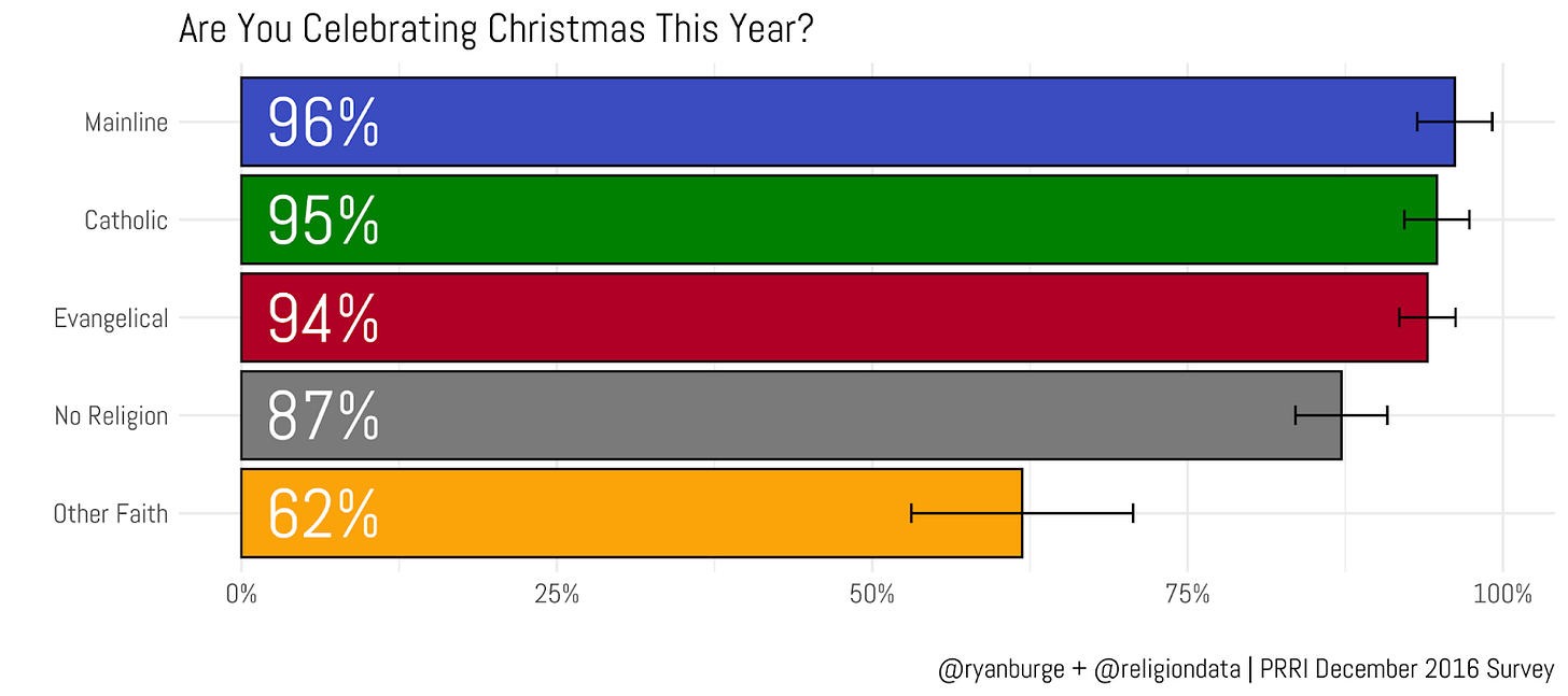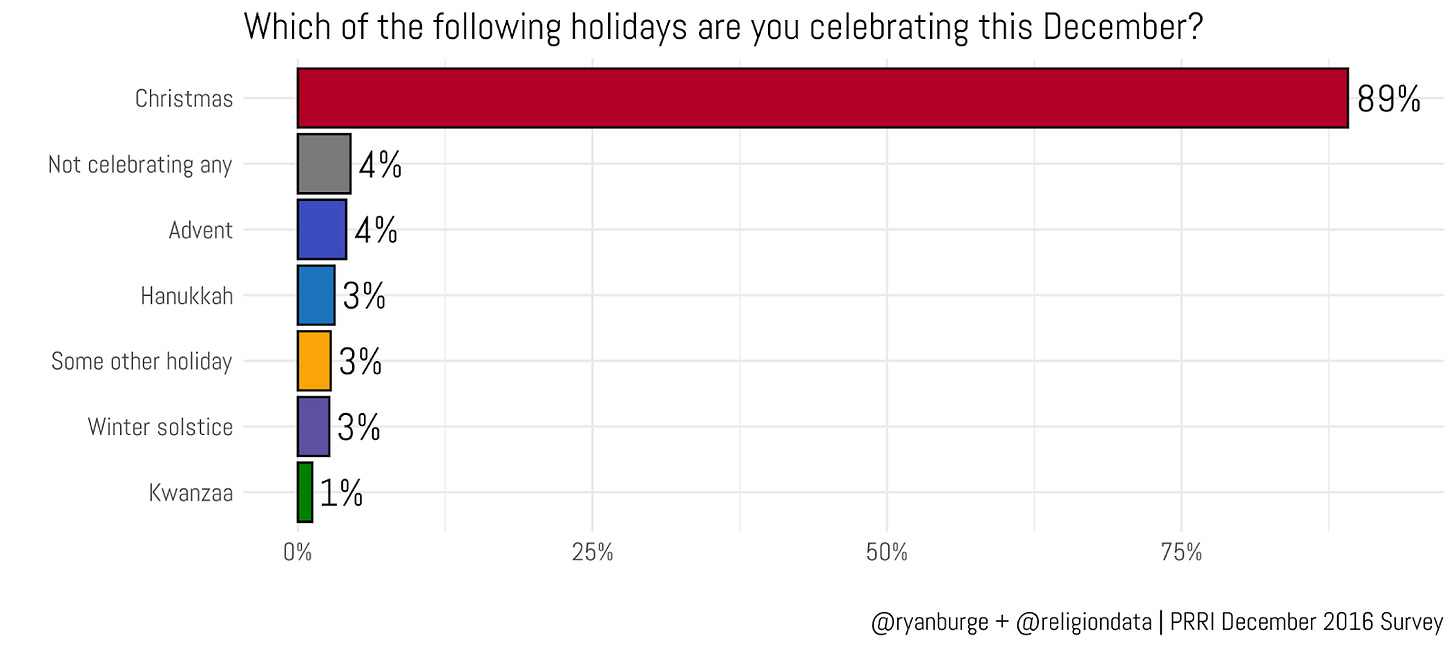 But I did find some really interesting data about celebrating the Christmas season. It’s posted on the Association of Religion Data Archives (ARDA). The survey comes from the Public Religion Research Institute (PRRI), and it was fielded in December of 2016 to about 1,000 American adults.