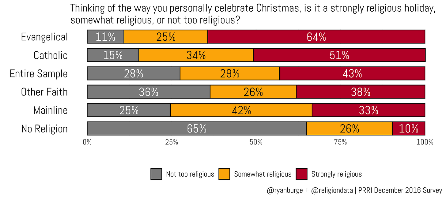 To drive home that point, I wanted to show you the responses to the question: Thinking of the way you personally celebrate Christmas, is it a strongly religious holiday, somewhat religious, or not too religious?
