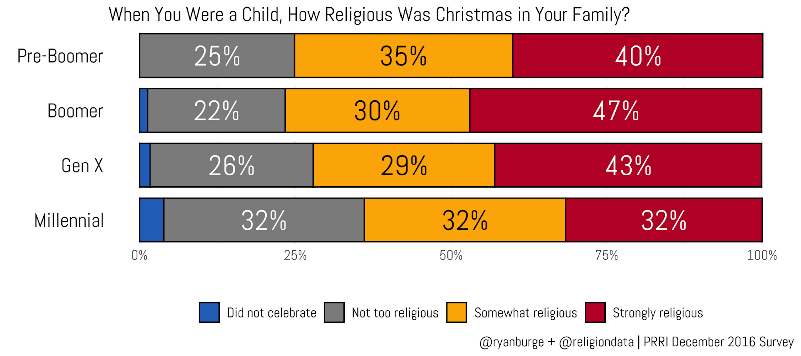 I broke this down into birth generations so that it would help paint a picture of what Christmas was like over the last hundred years or so. This is the best approach I have to explore a question like: Has Christmas become more secular over time?