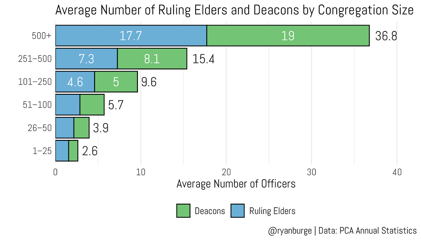 So, how many deacons and elders does the average PCA church have? To answer that, we need to break things down by church size.