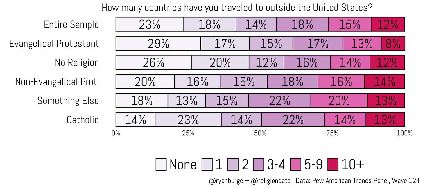 When I break it down by religious group, some noticeable patterns emerge. For instance, 29% of evangelicals had not left the United States, and only 21% had visited at least five foreign countries. From this angle, evangelicals are the least likely to travel outside the country.