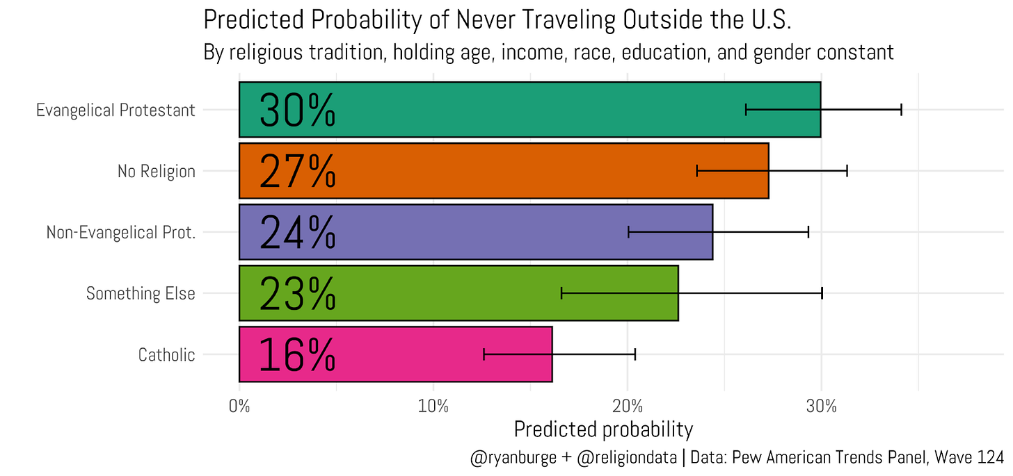 What the data indicate is that, if you compare a typical Evangelical Protestant to a typical Catholic (while holding constant a range of demographic factors) the Evangelical is about twice as likely to have never left the United States (30% vs. 16%). That’s a sizable gap, even after accounting for margins of error. And remember, this is after controlling for the respondent’s race.