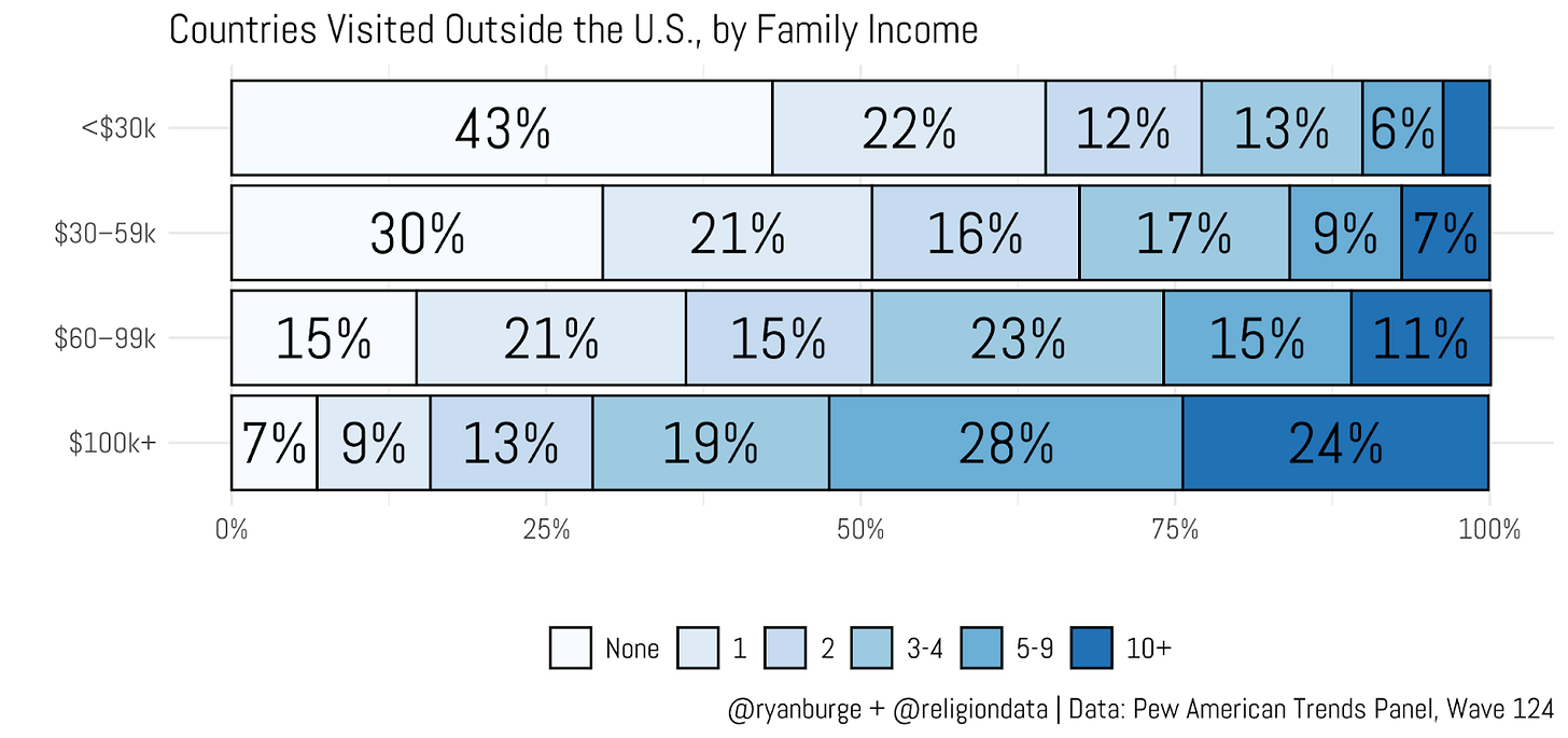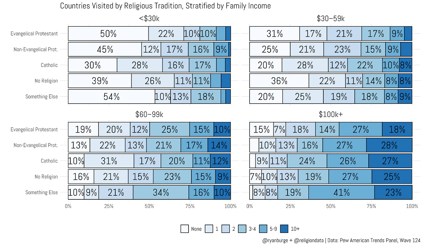 You can see it on the right-hand side of the graph, too. Among people in the lowest income category, only 10% had visited five or more countries. It’s 52% in the top income bracket. So, yes, income plays a huge role here—and it may be doing a lot of the work in explaining the differences in travel frequency across religious traditions.
