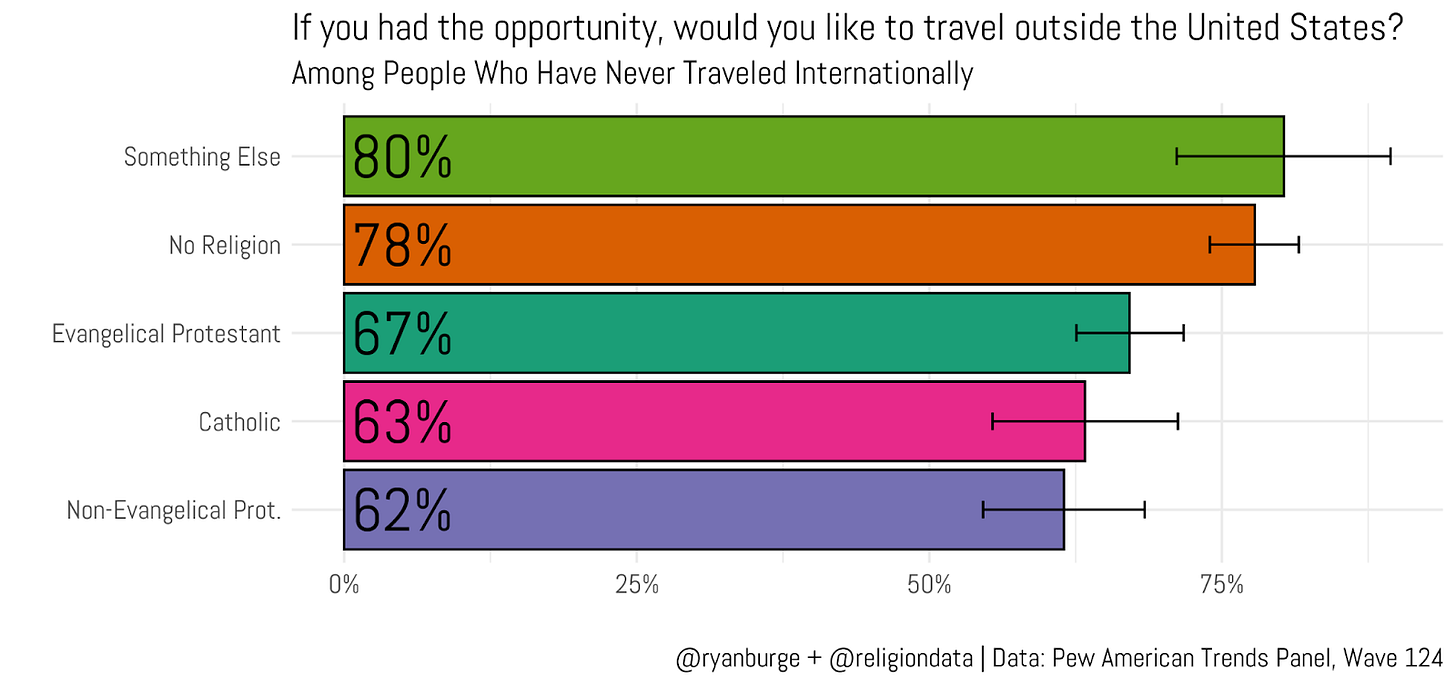 But we don’t see that here when we look at international travel. There’s no real evidence that the Nones are more likely to jet-set around the world than Catholics or Evangelicals. It’s a good reminder that decision-making is shaped by a lot of factors. Things like personality dispositions, yes, but also practical constraints like finances and time off work.