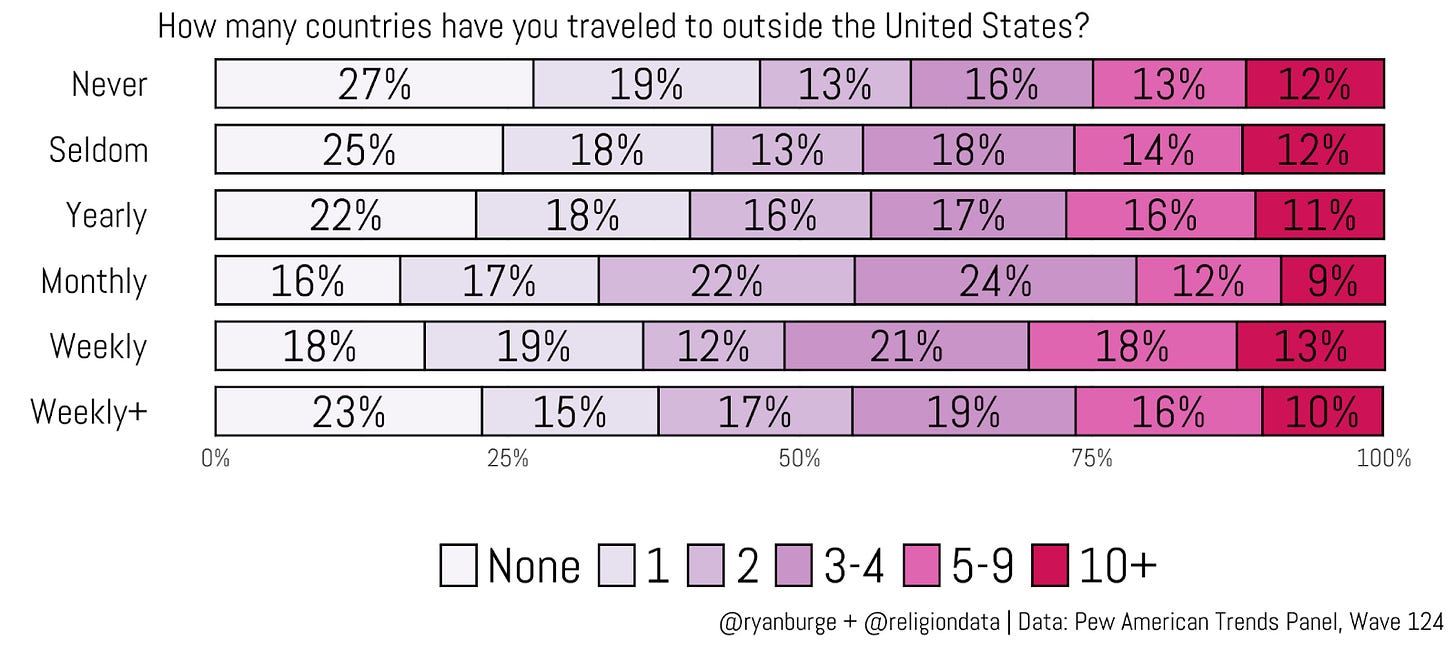 But the data does not confirm that hypothesis. Instead, it’s the never-attenders who are most likely not to leave the country—27% chose the “none” option—compared to 25% who had visited at least five countries outside the United States. Among folks who said they attend church weekly, 31% were in the “frequent traveler” category, the highest of any level of religious attendance.