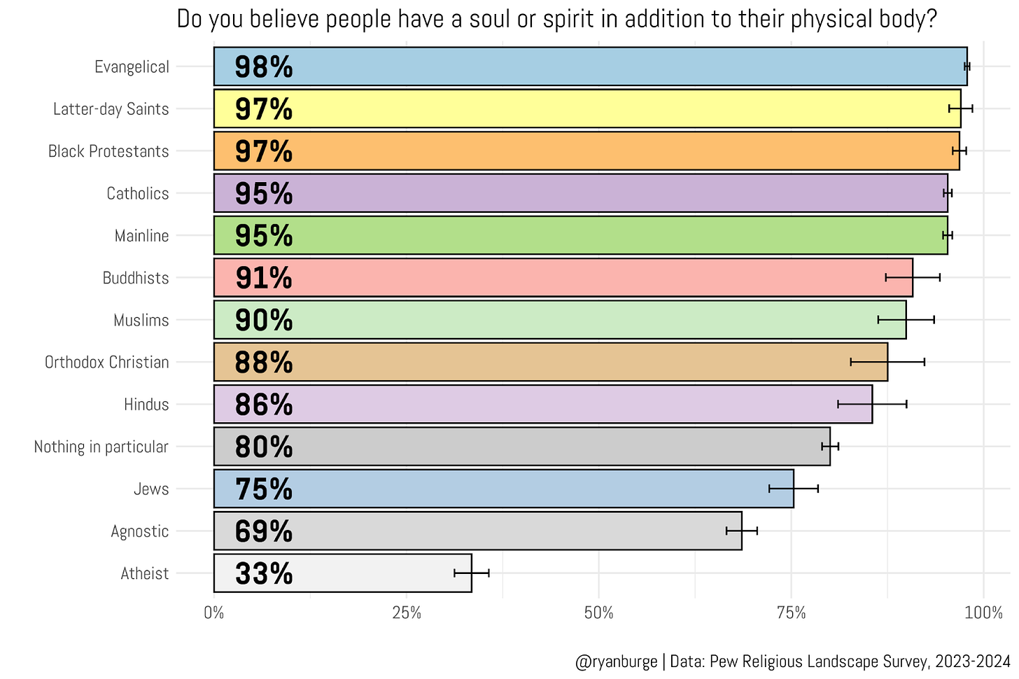 Almost everyone believes in a soul—except for atheists. They are the clear outlier on this question.