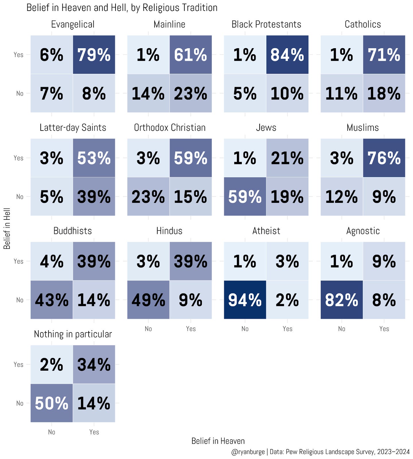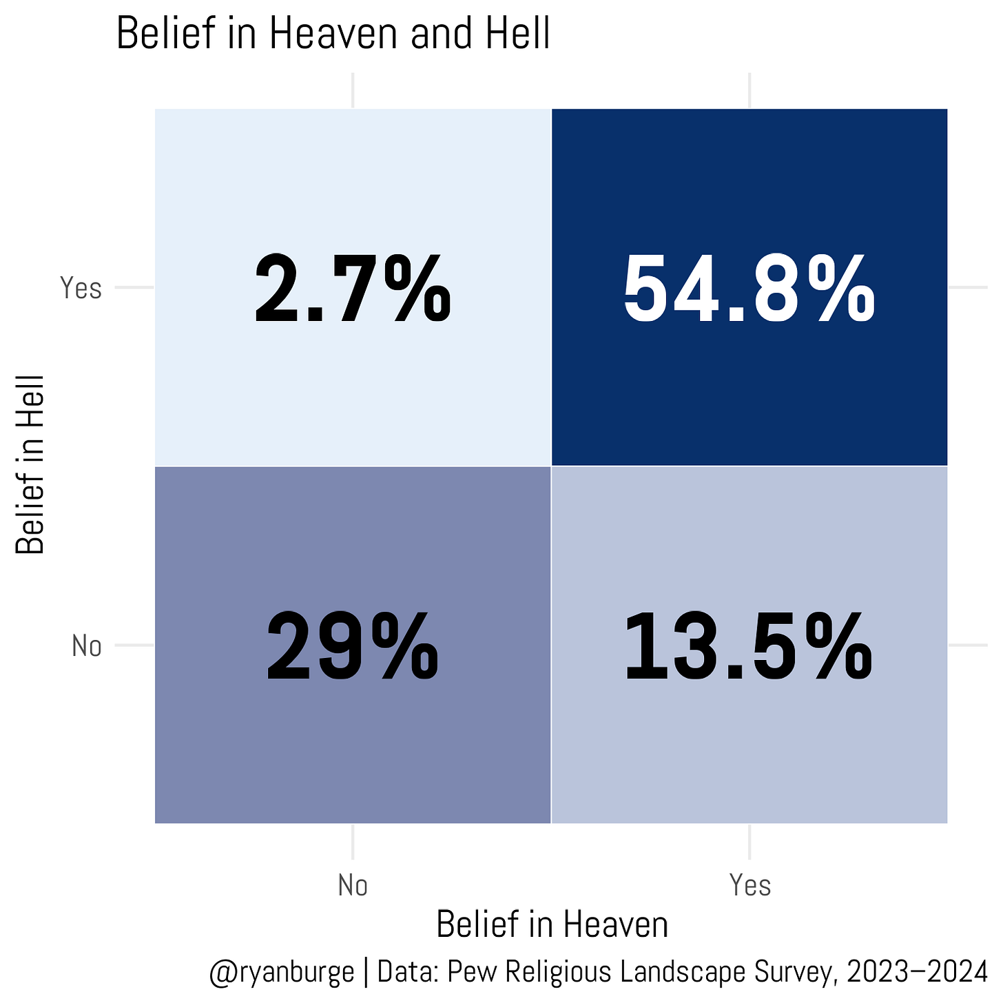I thought it would be most insightful to look at how respondents fell across both axes at the same time; that way, we could isolate the share who believes in heaven but not hell, for instance.