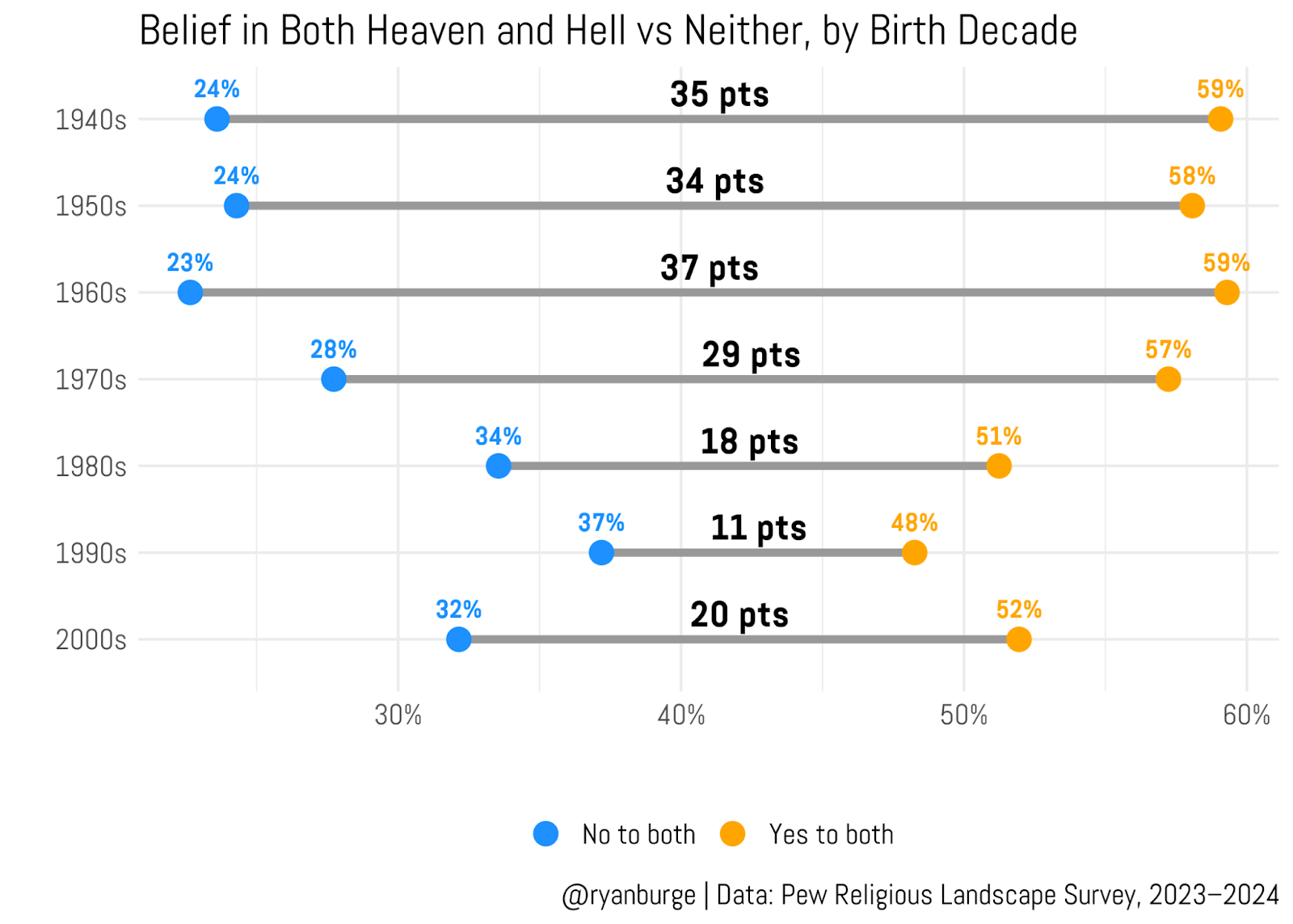 When we get into folks born in 1970 or later, you can see that beliefs begin to shift. For this birth cohort, 57% believe in both and 28% believe in neither—a gap of 29 percentage points. But then the gap gets a whole lot smaller in the next two birth decades: 18 points among people born in the 1980s and 11 points for respondents born in the 1990s. You can see that this narrowing is occurring because both points are moving toward the center.