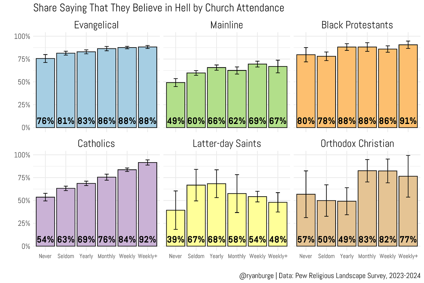 I really like this graph because it tells a compelling story about the impact of church attendance on beliefs. Among both evangelicals and Black Protestants, the share who believe in hell does rise as church attendance becomes more frequent. But the effect is pretty minimal: 12 points for evangelicals and 11 points for Black Protestants when going from never attending to more than once a week. So even non-attenders hold to a pretty orthodox view of things.