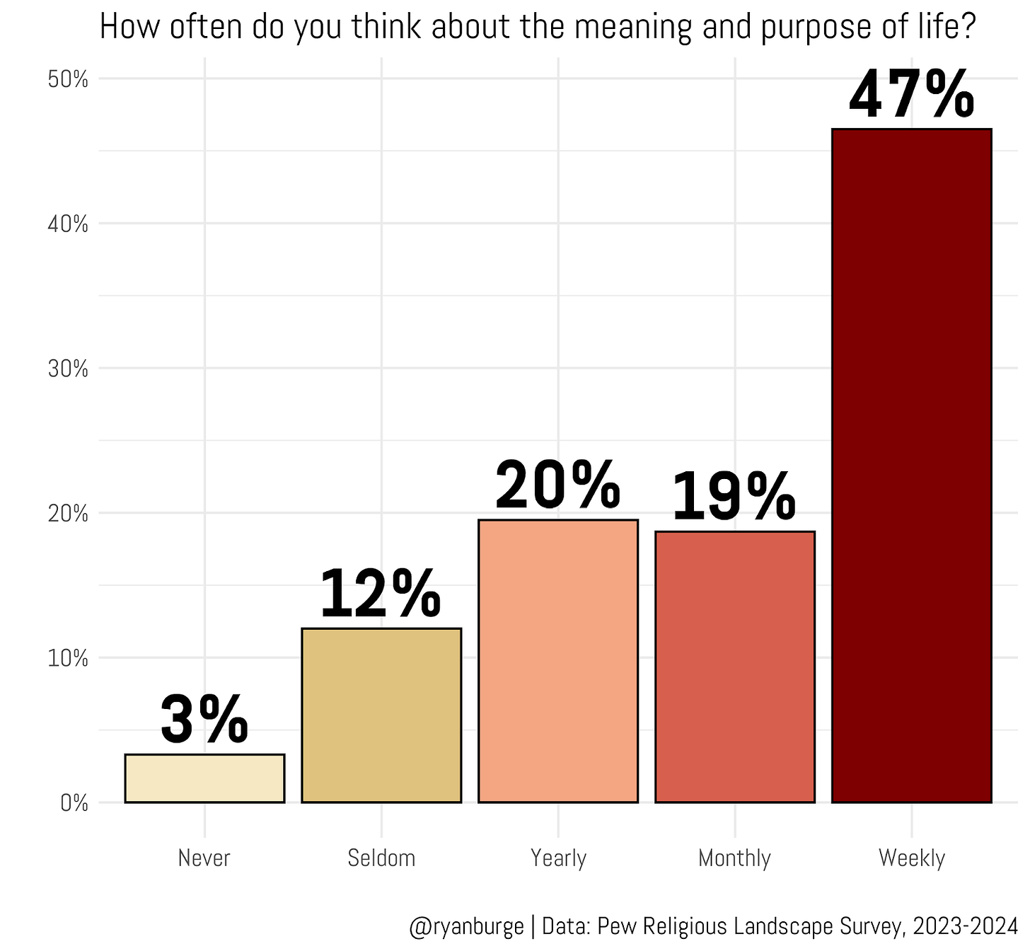 Pew included a question on their Religious Landscape Survey that was really simple: “How often do you think about the meaning and purpose of life?” The response options ranged from “never” to “at least once a week.” This was absolutely an example of a time when I had zero idea how folks would respond to a question like that.
