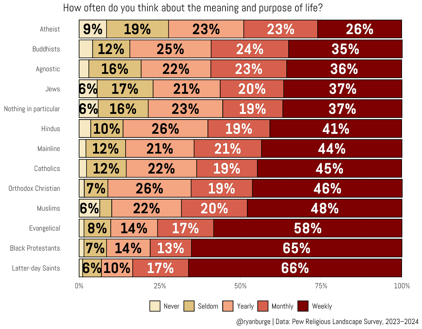 Which means that a lot of really religious groups can be found at the other end of the graph. The two groups that think about these existential questions the most are Latter-day Saints and Black Protestants—two-thirds are thinking about this stuff on a weekly basis. Then there’s a bit of a gap before evangelicals show up at 58%. But it’s fascinating to me how there’s a clear connection between religious groups that have a high level of engagement and groups that also think about meaning and purpose a whole bunch. It’s like those two things run hand in hand with each other.