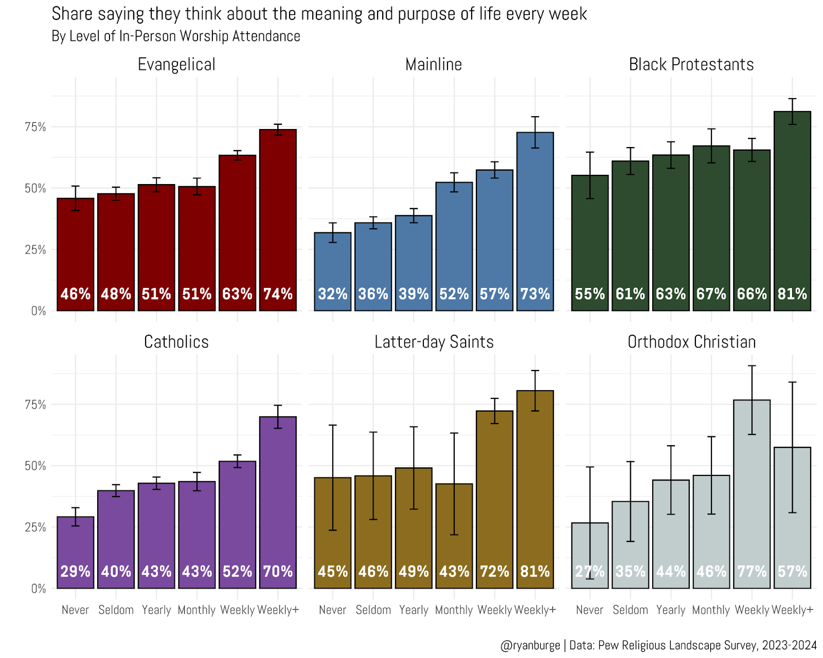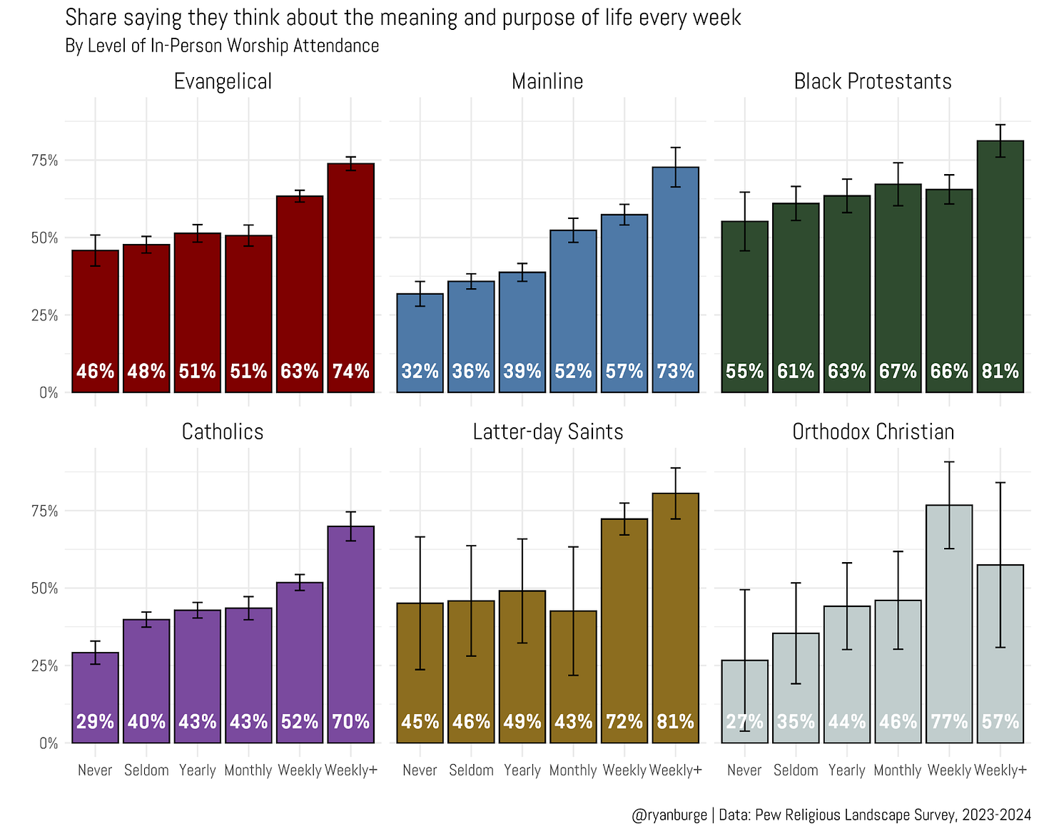 For mainline Protestants, the divide is between weekly (57%) and more than once per week (73%). You can also see a jump among Black Protestants who are attending more than once a week, as well. For Catholics, there’s a clear connection between Mass attendance and thinking about meaning and purpose—it rises nine percentage points when going from monthly to weekly attendance, and then it goes up a whopping 18 percentage points for those who go to Mass multiple times per week.