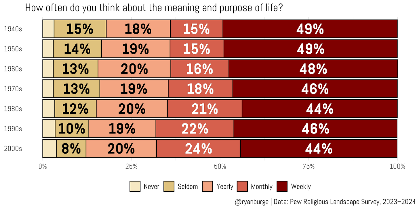 You do see that “weekly” number decline just a little bit among younger folks, but it’s not by a huge amount. Among respondents who were born in the early 2000s, 44% were thinking about meaning and purpose every week. That’s five points lower than those born sixty years earlier. But then an even bigger share (24%) say that they think about these topics every month. So, if you add together the monthly and weekly shares among the youngest cohort, it’s 68%. For the oldest respondents, it’s 64%.