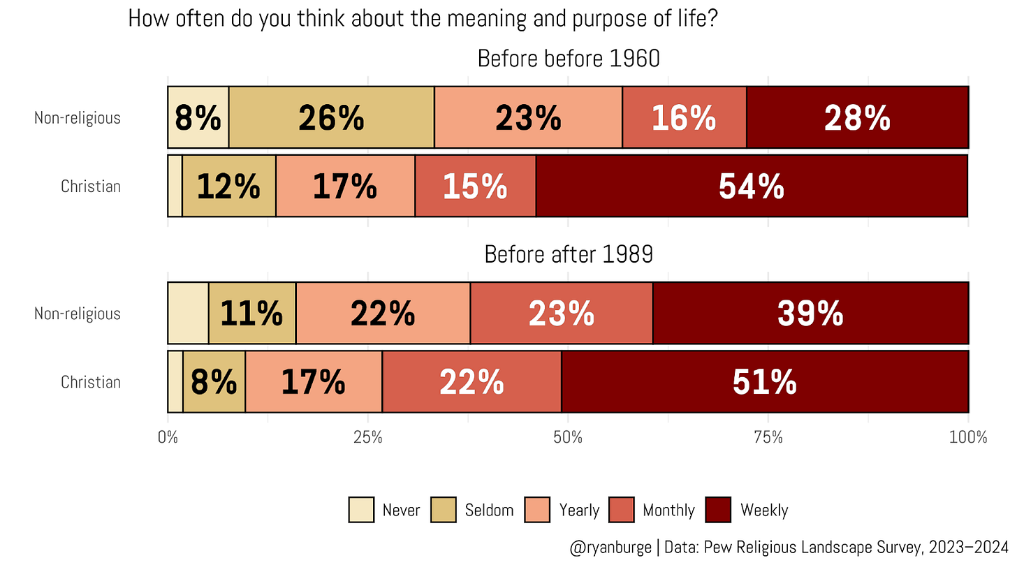 But here’s something else worth flagging—older Christians think about meaning and purpose with greater frequency than younger Christians. Among the non-religious, it’s the exact opposite. Retired nones rarely think about these questions, while younger nones are considering them often. I don’t have a good explanation for that, honestly.