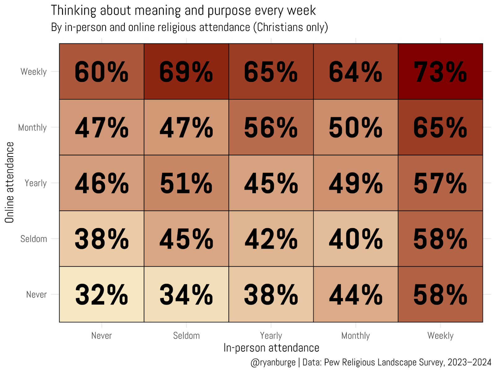 Look at the top-left square in the heatmap. This is folks who never attend in person but watch online all the time. Among this subgroup, 60% of people think about meaning and purpose on a weekly basis. Now look at the bottom right—these are people who go in person all the time but never attend online. The percentage here is 58%. That’s actually really surprising to me because it suggests that being heavily involved in worship, whether online or in person, doesn’t make much of a difference when it comes to people contemplating the big questions in life.