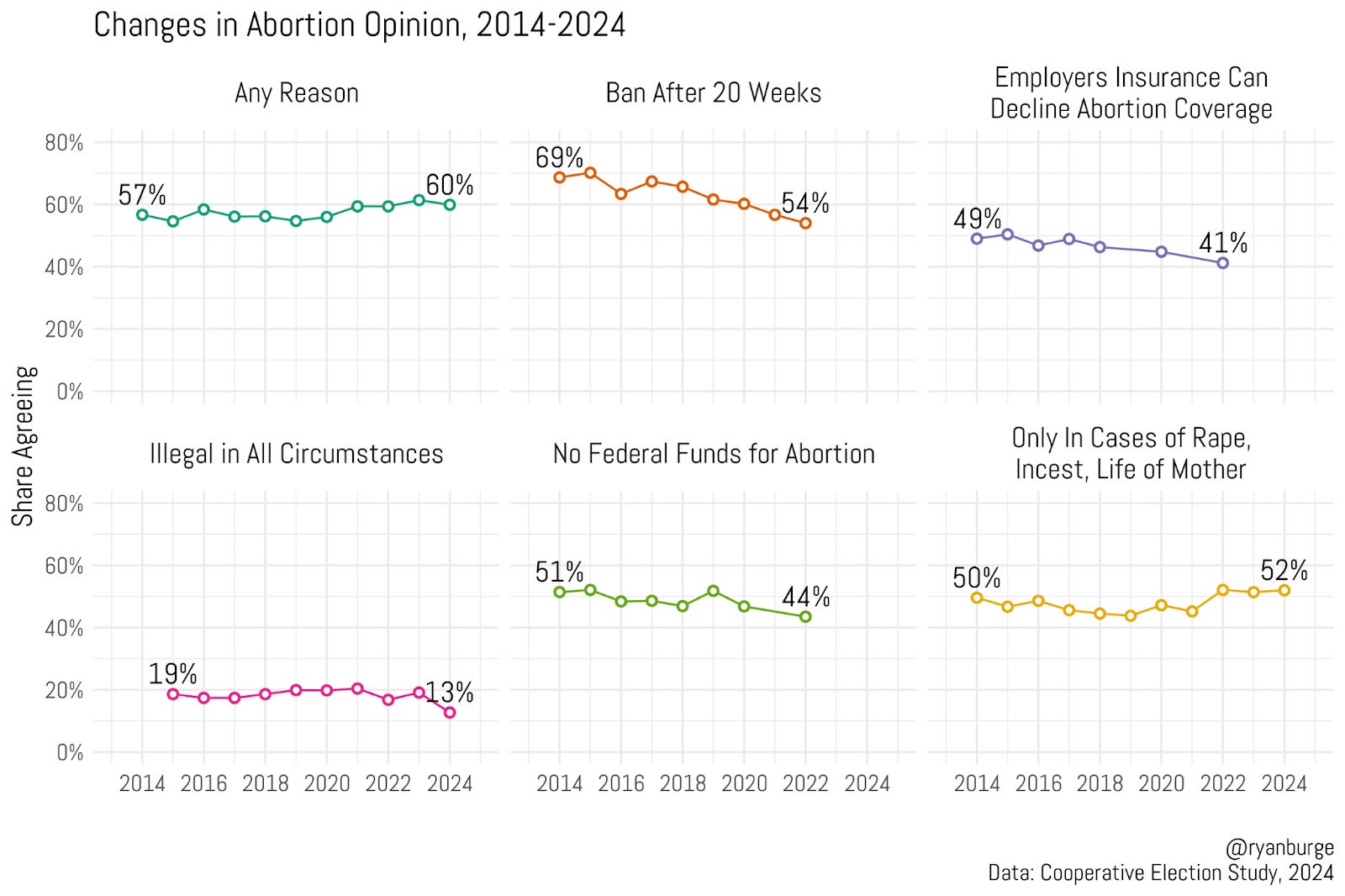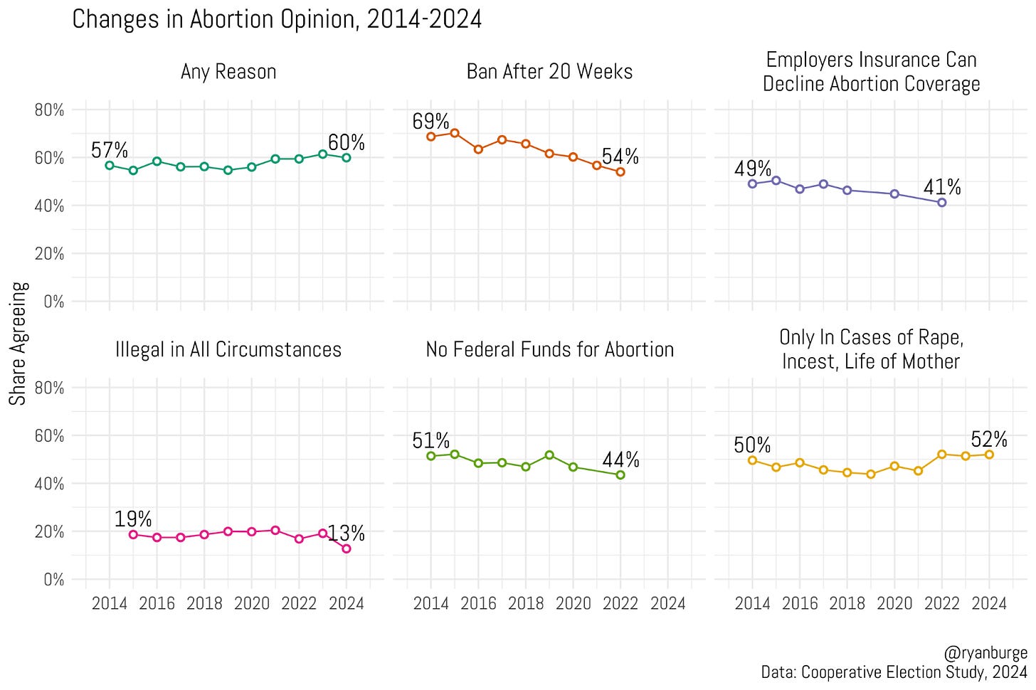 The Cooperative Election Study has asked a variety of questions about abortion for the last decade. Let’s start by tracking the answers to six of them.