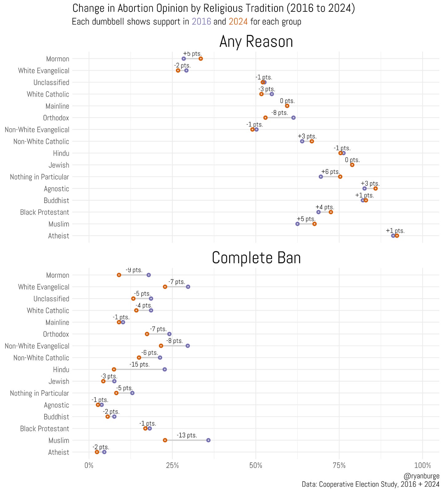 Okay, now let’s look through the lens of religious traditions. I’m comparing the 2016 data to the 2024 data on the same two abortion questions.