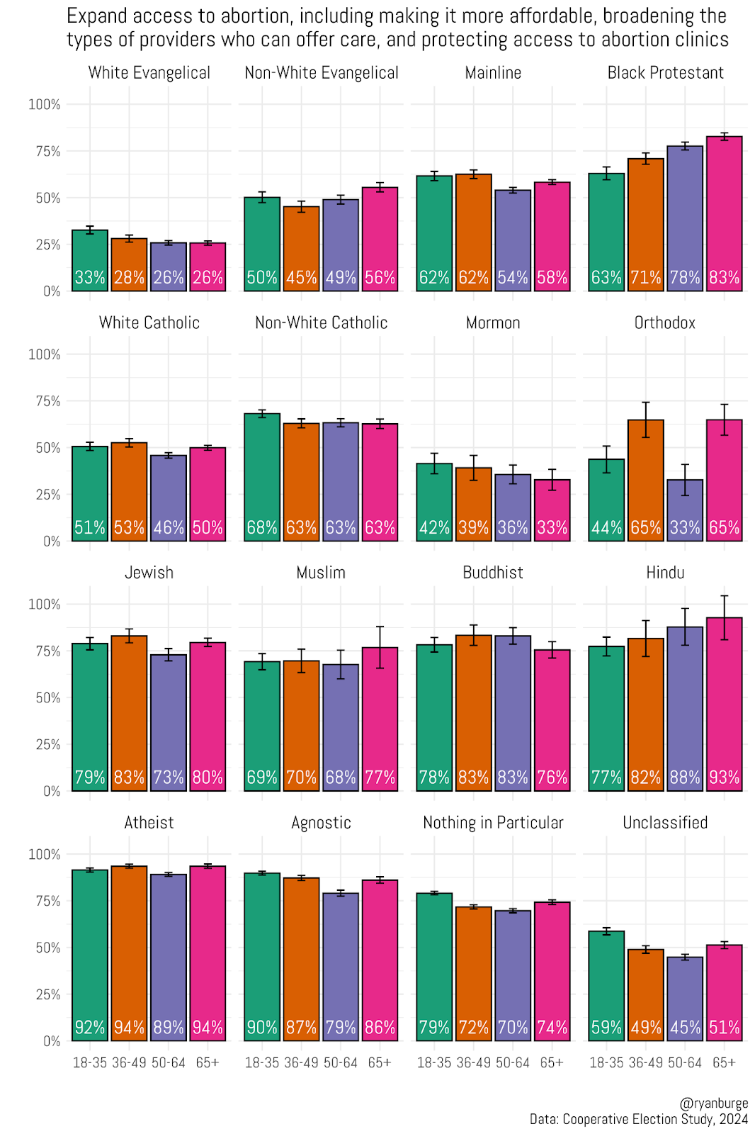 Finally, I wanted to end with a bit of age analysis. The CES included this interesting statement, “Expand access to abortion, including making it more affordable, broadening the types of providers who can offer care, and protecting access to abortion clinics.” This, to me, is a pretty good indication of a general comfort with the idea of abortion. I broke this down into 16 traditions and four age groups.