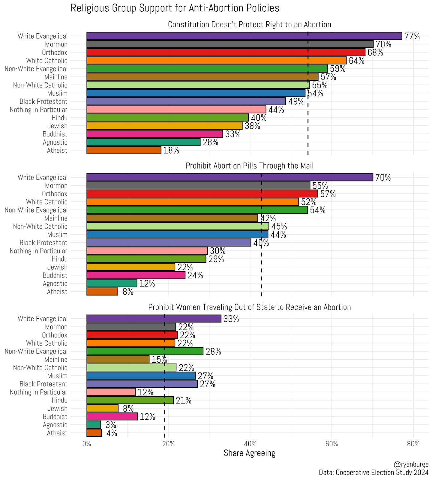 What about the possibility of banning abortion pills sent through the mail? That became a hot topic in 2024. Only 42% of the entire sample wanted to ban this practice. What strikes me about this result is how much white evangelicals stand out from the crowd - 70% of them support an end to abortion pills through the mail. A lot of the other traditionally pro-life groups are pretty mixed on this including LDS, Orthodox Christians, white Catholics, and non-white evangelicals. They all land around 55% in favor.