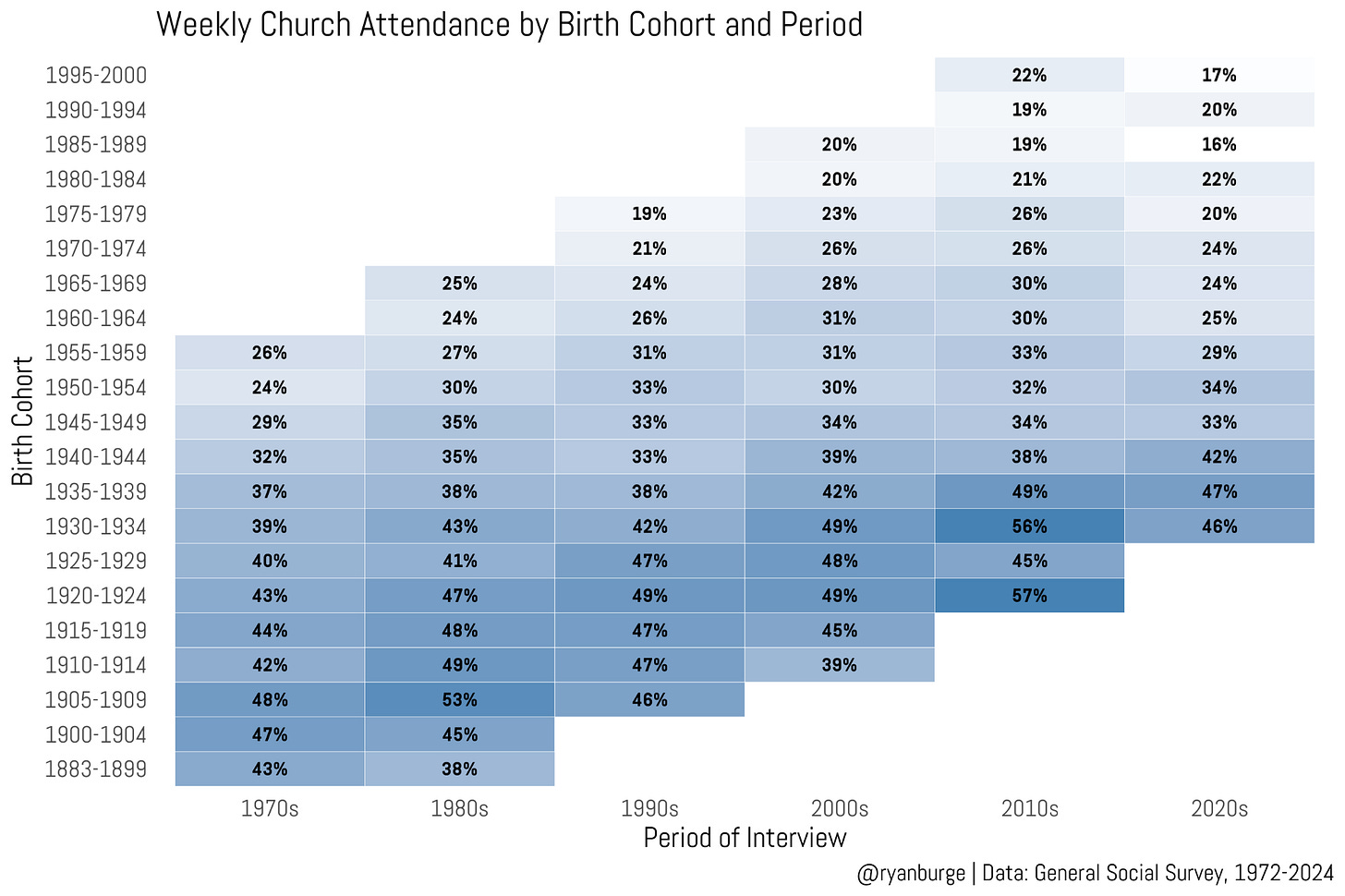If you scan your eye vertically up each column of numbers, what you essentially see is how religious attendance varies by age at a given point in time. You have older folks at the bottom of the heatmap and younger respondents at the top. For instance, look at the 1980s column. Among people born in the 1910s, nearly half of them reported weekly religious attendance. These folks were in their seventies when they took the GSS. But when you look further up, you can see people born in the 1960s—they were in their twenties when they answered the survey. Among this group, just a quarter were weekly attenders.
