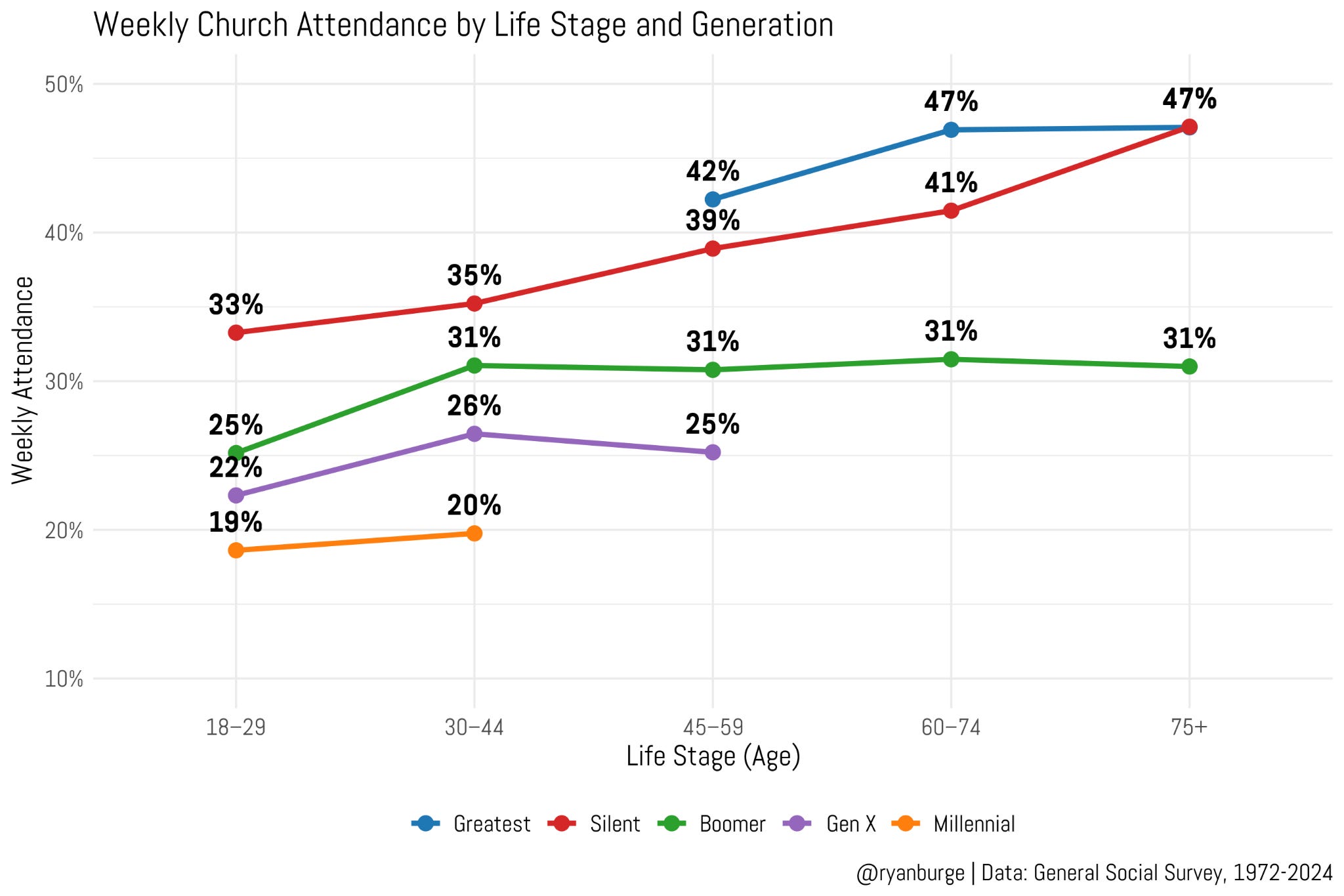 I really want to highlight the Silent Generation, because when the GSS started in 1972, it was picking up the tail end of that generation who were still in their twenties. According to the GSS, 33% were weekly attenders. But as they aged into older life stages, their attendance actually rose. And the rise was really remarkable: it climbed to 39% when they were in their late forties and fifties. And in the last life stage (75+), nearly half of Silents (47%) were attending nearly every week or more. That’s a 14-point rise as they aged through.