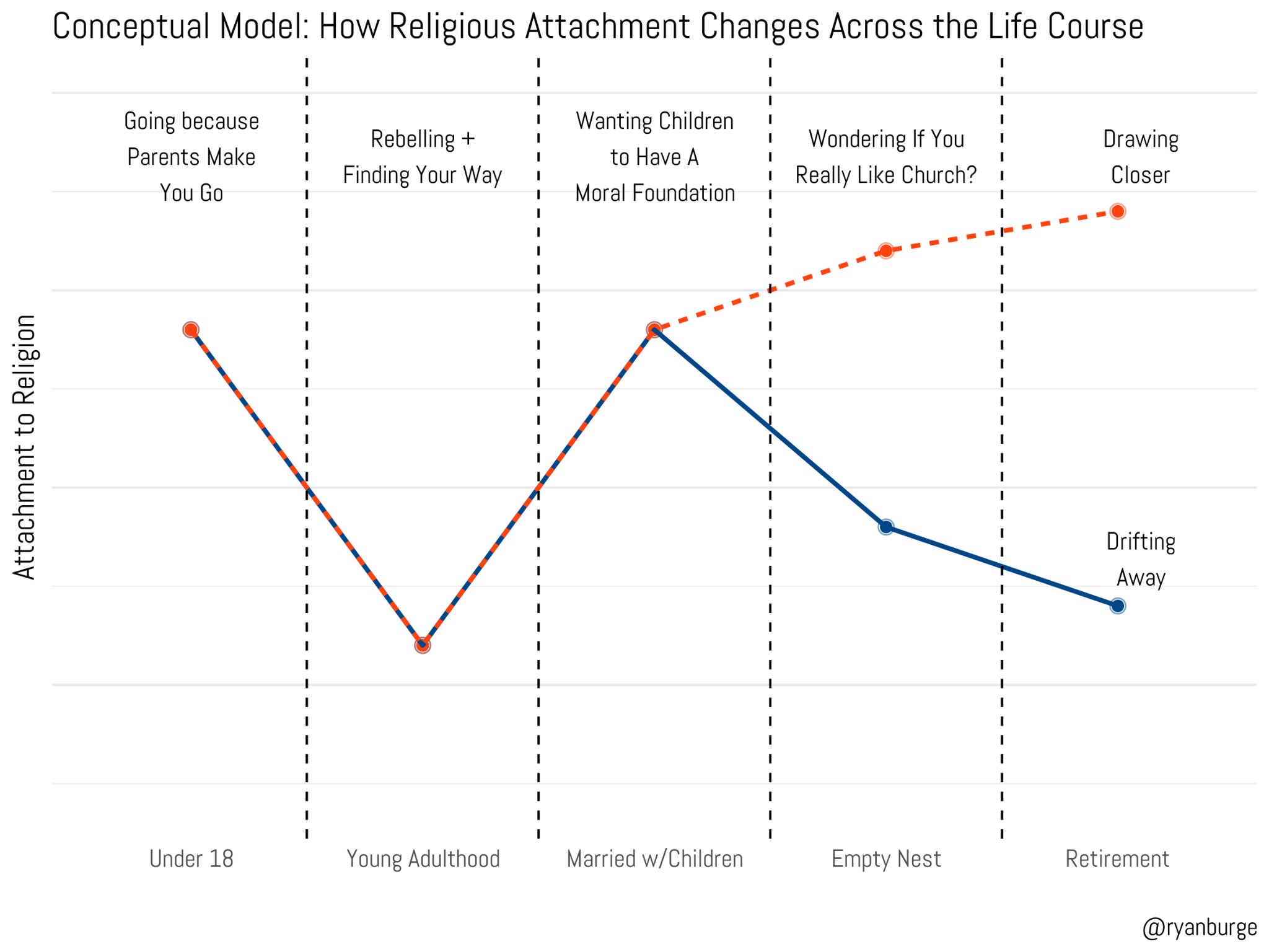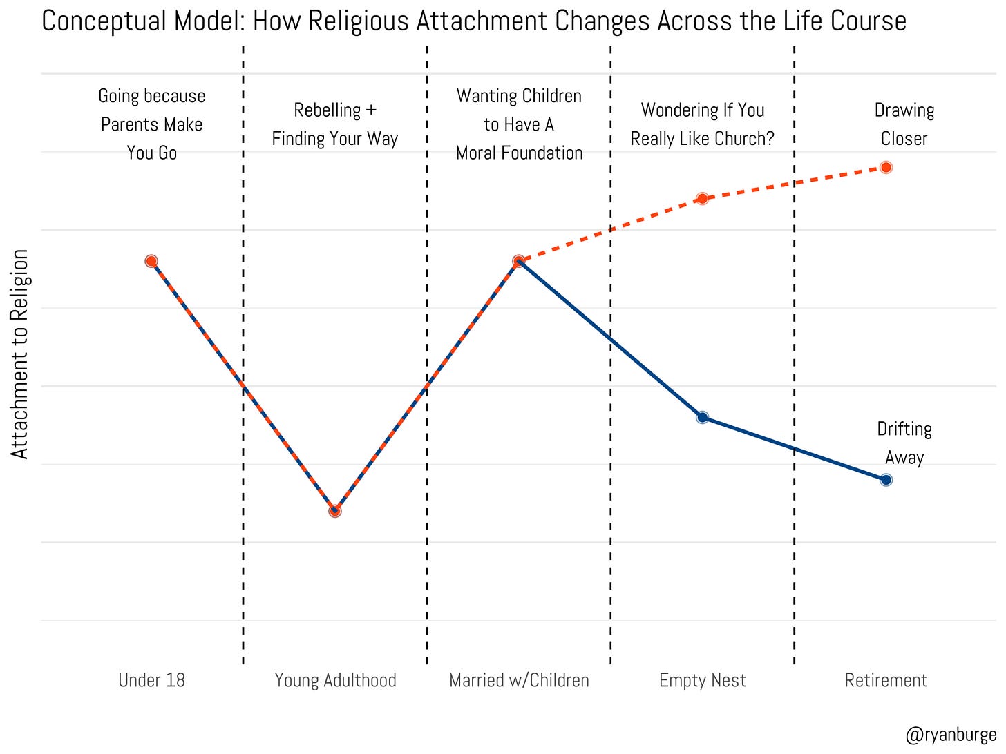 There’s a commonly held conception of how birth cohorts age when it comes to religion—it’s called the “life cycle effect.” I’ve done my best to visualize the most widely held understanding of this process in the graph below.