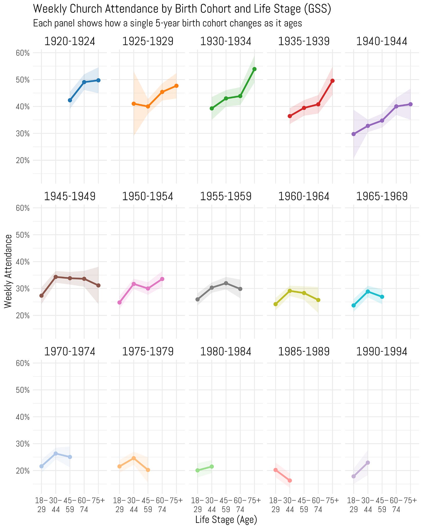 This puts a nice bow on what I described before in the previous graphs. Notice the top row—that’s folks who make up the Silent Generation. Their attendance clearly continued to rise as they aged. It’s as clear as day for people born between 1925 and 1945. And these jumps are massive. For those born in the 1930s, about 40% were weekly attenders in their 30s. By the time they hit their 70s, attendance rates were 55%.