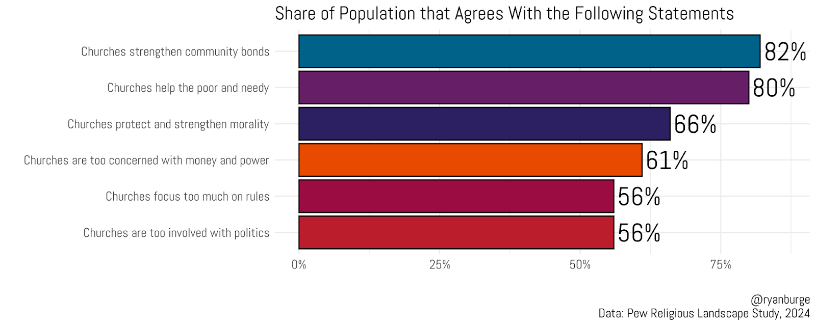 It’s interesting to note that at least half of the sample agreed to every single one of the statements - positive or negative. But there is overwhelming agreement on two points - churches strengthen community bonds and churches help the poor and the needy. In both cases, at least 80% of folks agreed. Then, two in three Americans said that “churches protect and strengthen morality.” So, from this angle religion is pretty well respected in the general public and the average American believes that churches serve an important role in terms of community building, serving the disadvantaged, and strengthening morality.