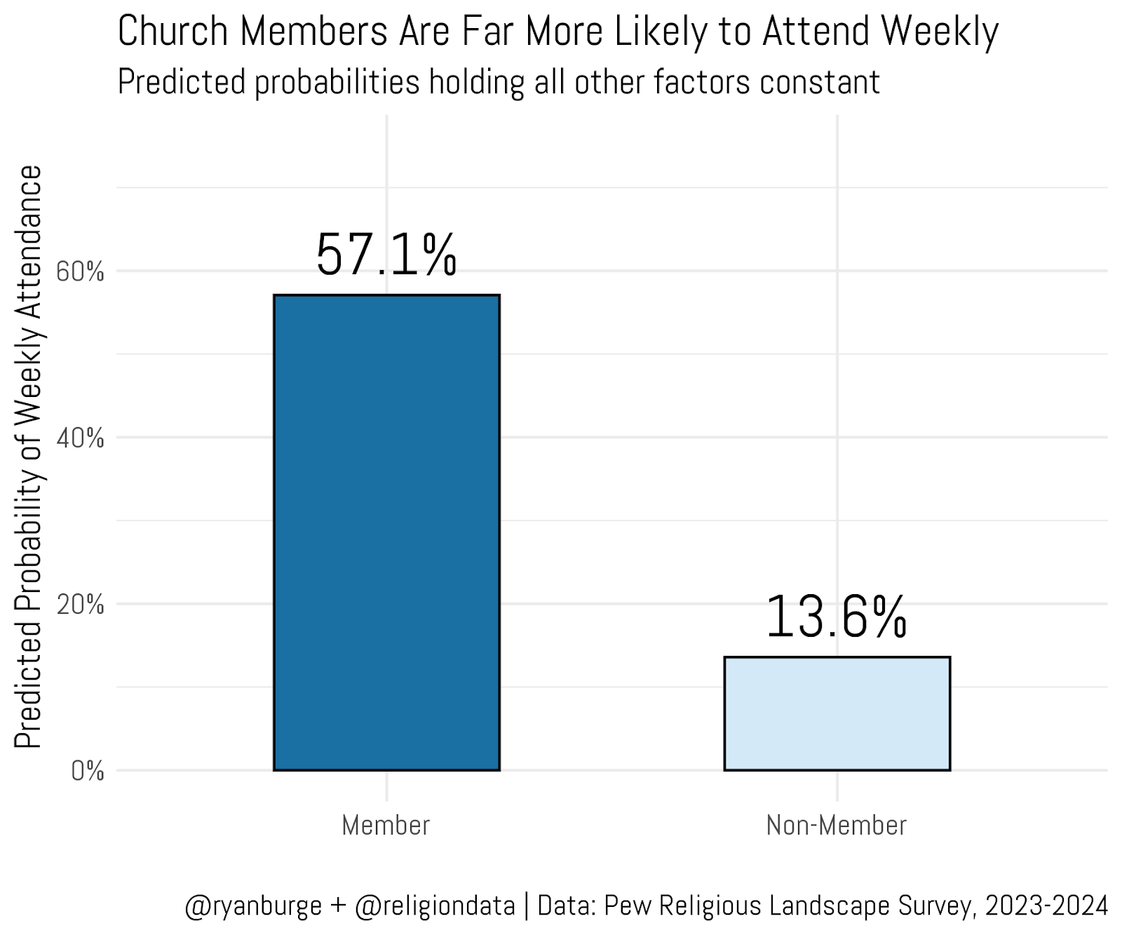 4. Being a member of a local house of worship is incredibly predictive of being a regular attender at a church, synagogue, mosque, etc. This data indicates that a member is three times more likely to be a weekly attender compared to a non-member, even after controlling for all kinds of other factors.