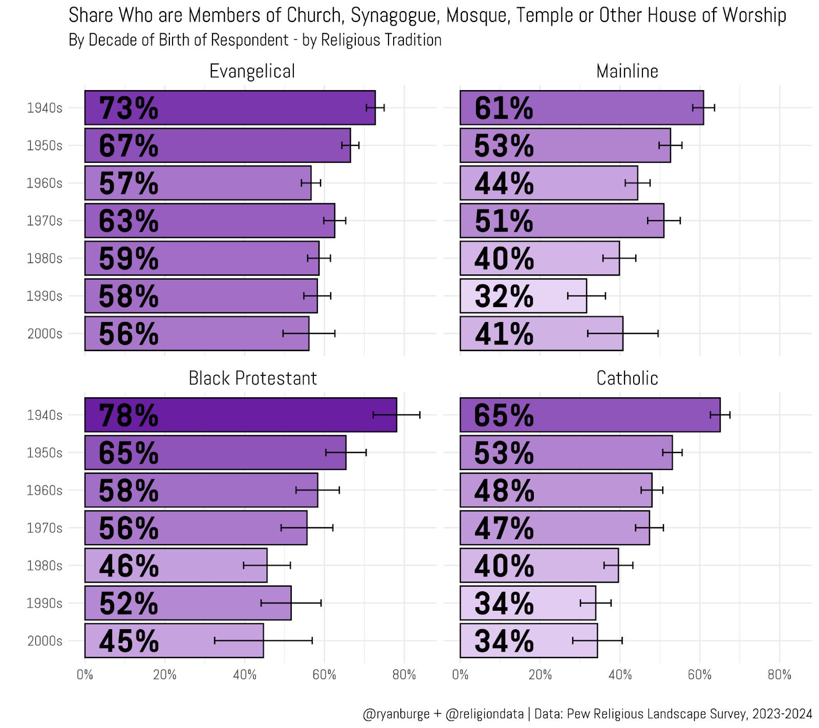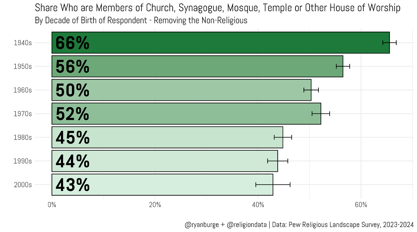 These numbers are quite a bit more robust than the prior graph. Here, church membership rates stay above 50% for folks born in the 1970s or earlier. That’s a noticeable uptick from the first graph. But the same general trend does seem to appear that we discussed before: older folks are more inclined to become members at a house of worship. That’s not so commonplace among younger respondents.